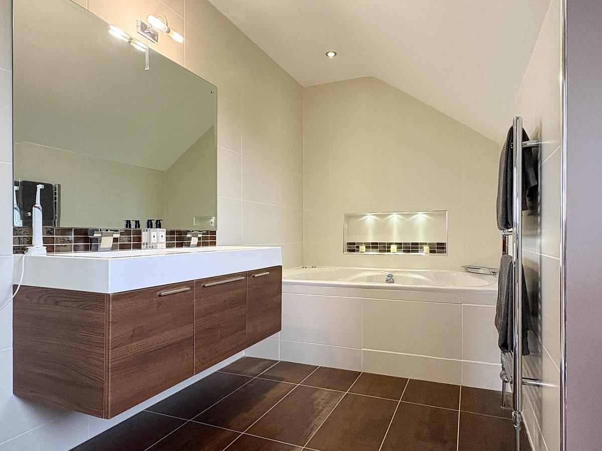 Comprising Jacuzzi bath with recess shelf above, twin wash hand basin set on vanity unit, w.c., tiled shower enclosure with recess shelf, mains rainfall shower and body shower attachment, tiled walls around amenities, tiled floor, recess lighting, heated towel rail, extractor fan, shaver point, wall mounted mirror with light above.