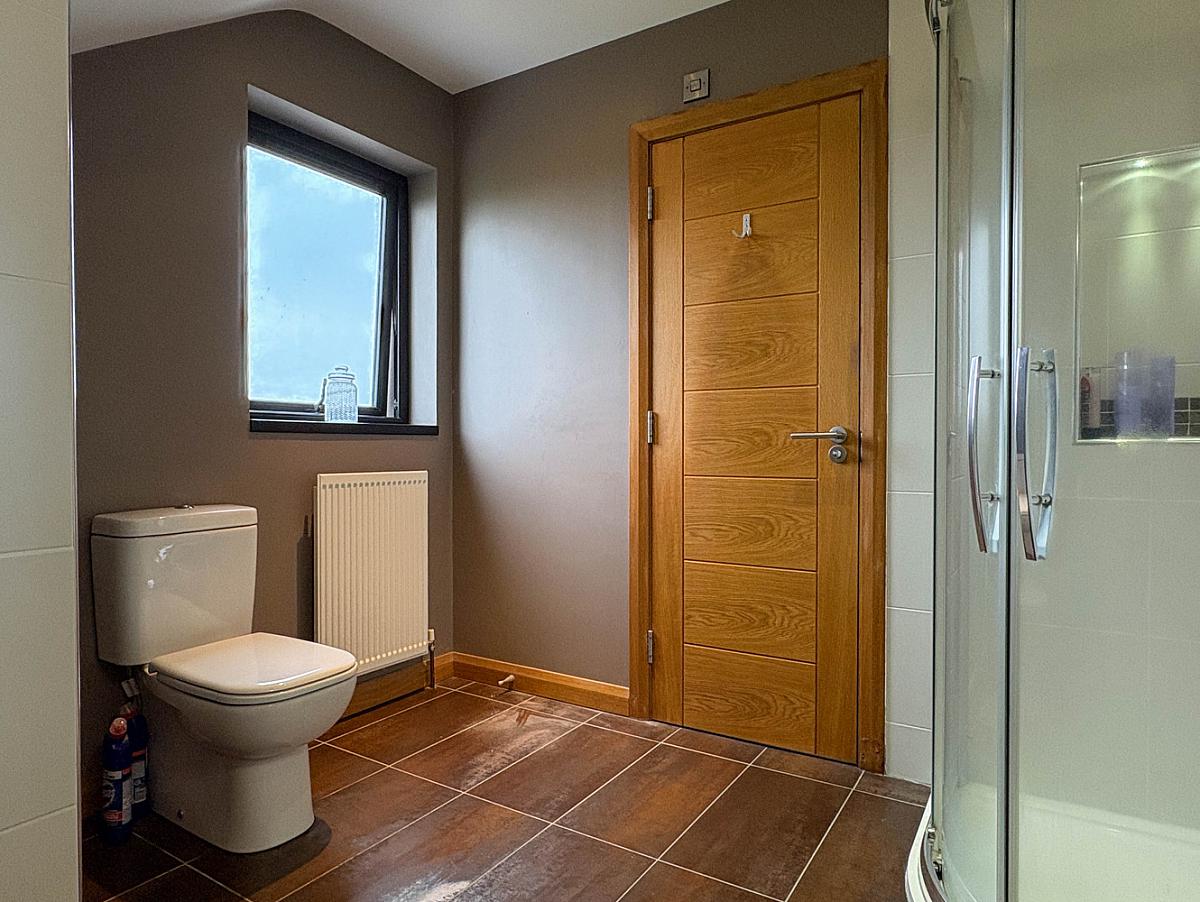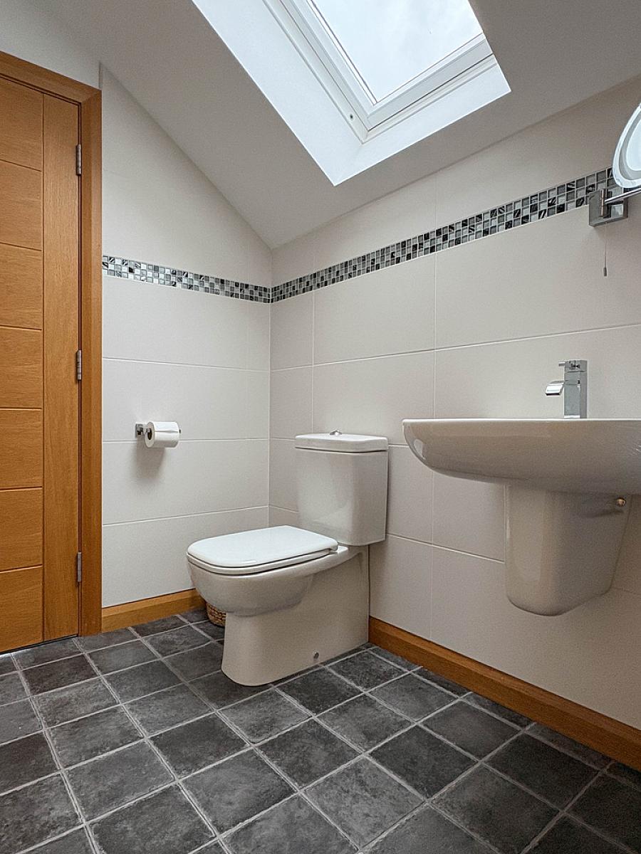 Comprising tiled shower enclosure with glass screen and mains rainfall shower and body shower attachment, recess shelf, wash hand basin, w.c., heated towel rail, recess lighting, extractor fan, shaver point, mostly tiled walls, Keylite sky window.
