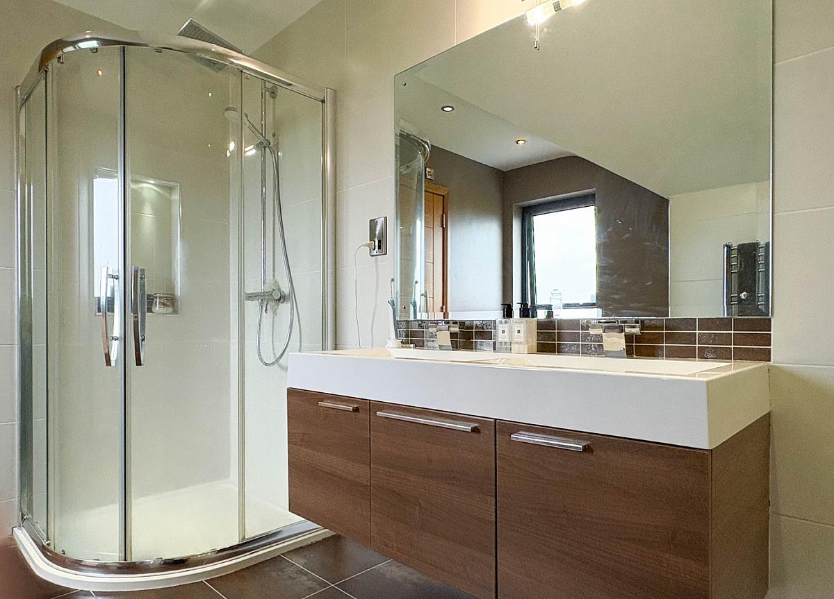 Comprising tiled shower enclosure with mains shower fitting, recess shelf, wash hand basin set on vanity unit, w.c., heated towel rail, recess lighting, extractor fan, shaver point, wall mounted touch light mirror, bathroom cabinet.