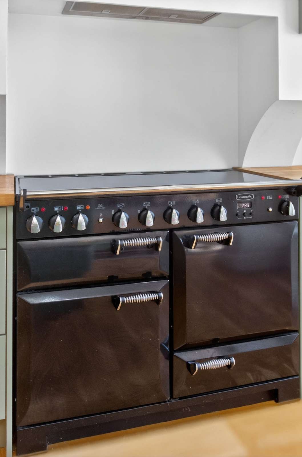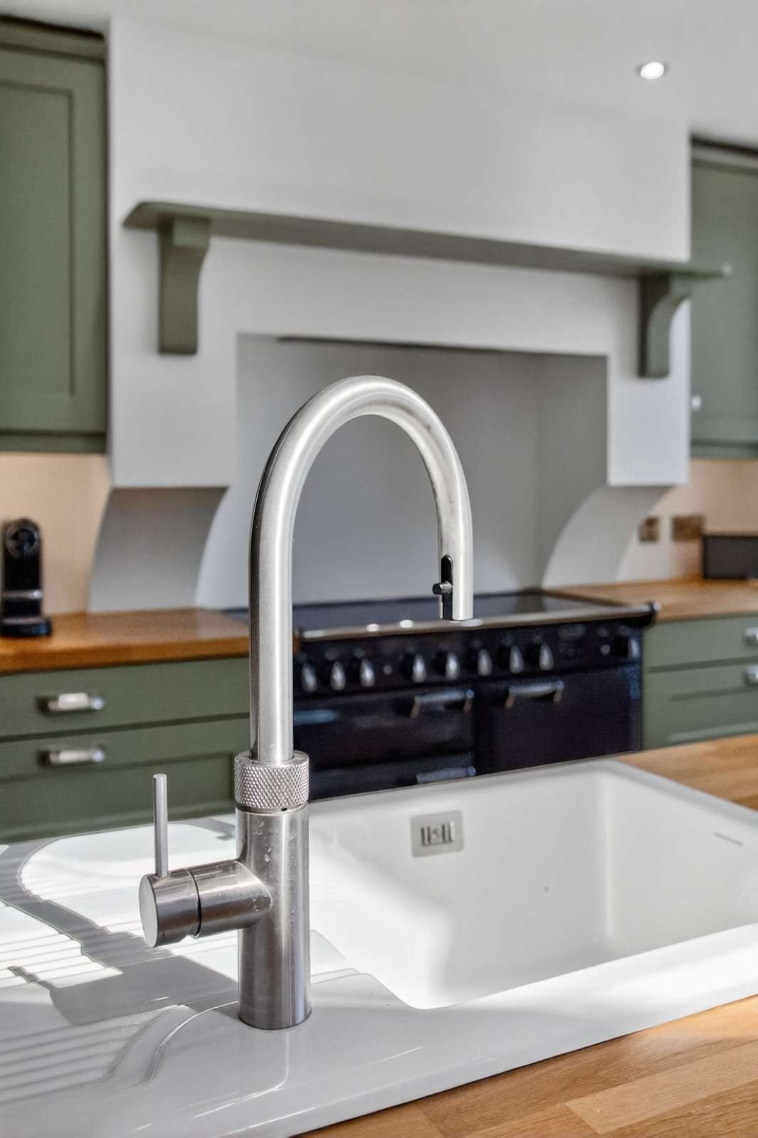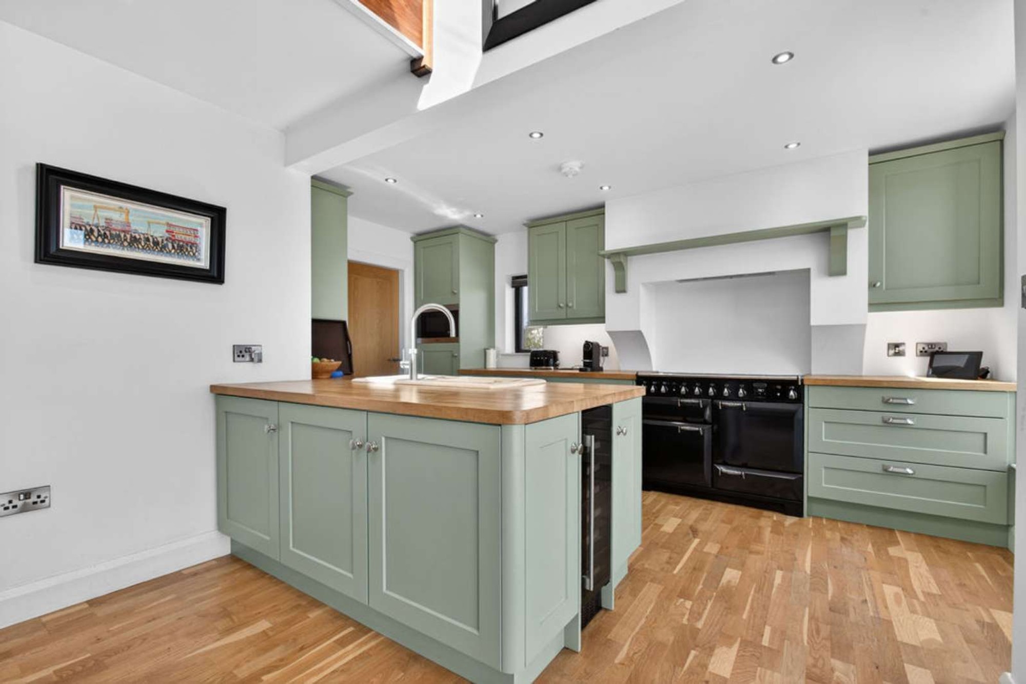 Kitchen with a range of attractive painted finish eye and low level units, solid wood worktops, ceramic sink with a Quooker hot water tap, space for a range type cooker with an extractor canopy over, numerous pan drawers, integrated fridge/freezer, integrated dishwasher, wine fridge, eye level microwave, wooden floor and open plan to the living/dining room area.