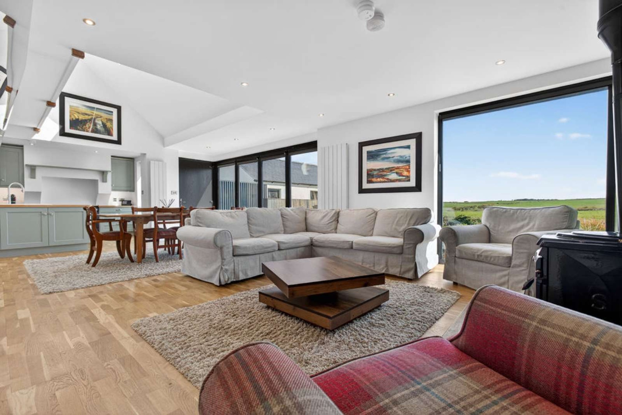 A superb open plan room including a partially vaulted ceiling to the upper floor minstrel gallery landing area, feature Bi fold glazing and large windows providing outstanding views to the rear over miles of open countryside, feature wall mounted contemporary radiators, recessed ceiling spotlights, attractive wood flooring and a feature "Stanley" multi fuel stove on a granite hearth providing a feature point during those long winter evenings.