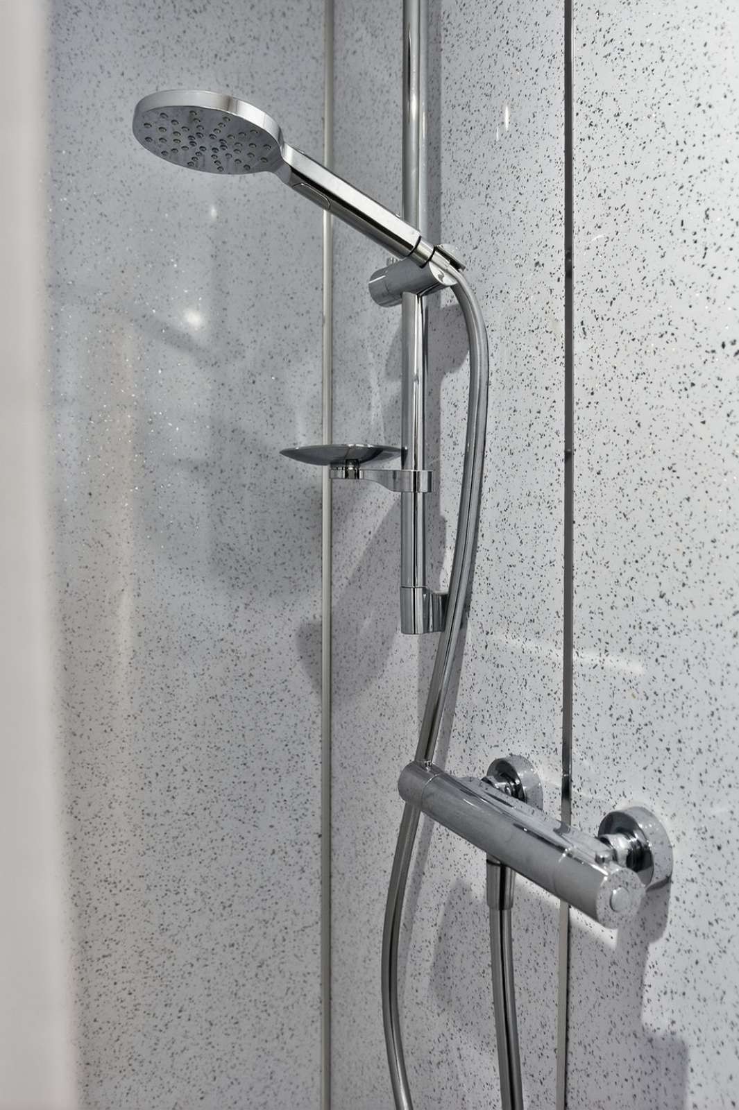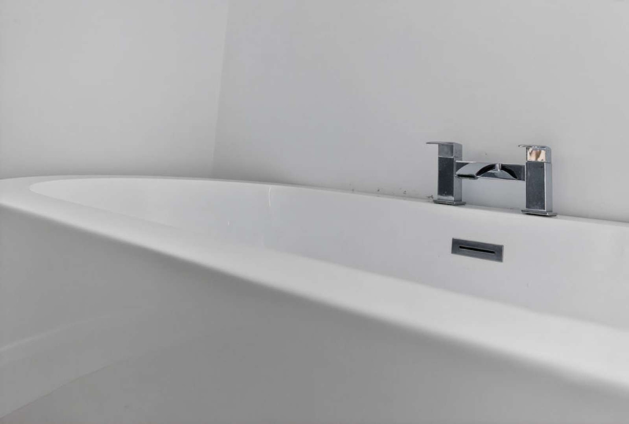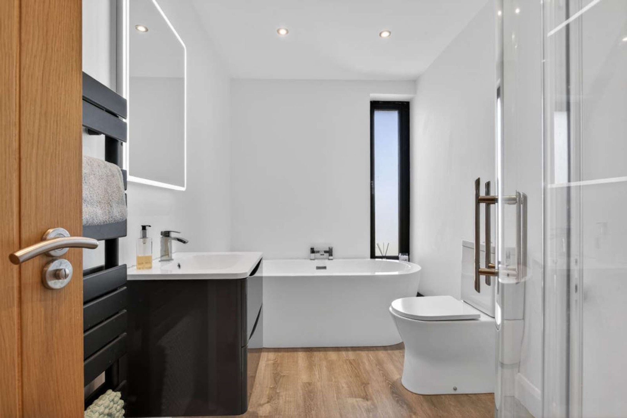 A luxurious family bathroom including a free standing bath with a mixer tap unit, wall mounted vanity unit with storage drawers below, w.c, contemporary heated towel rail, ceiling spotlights and a panelled shower cubicle with a mains mixer shower including a drench head over and a feature hand shower attachment.