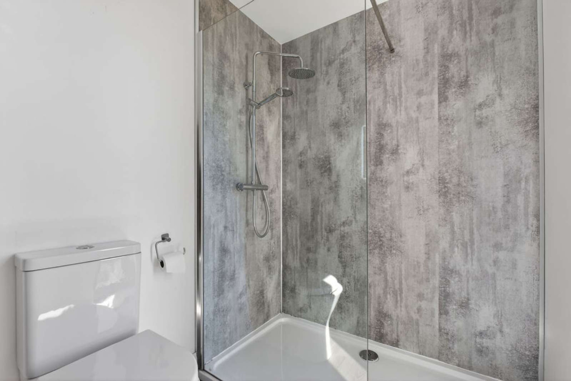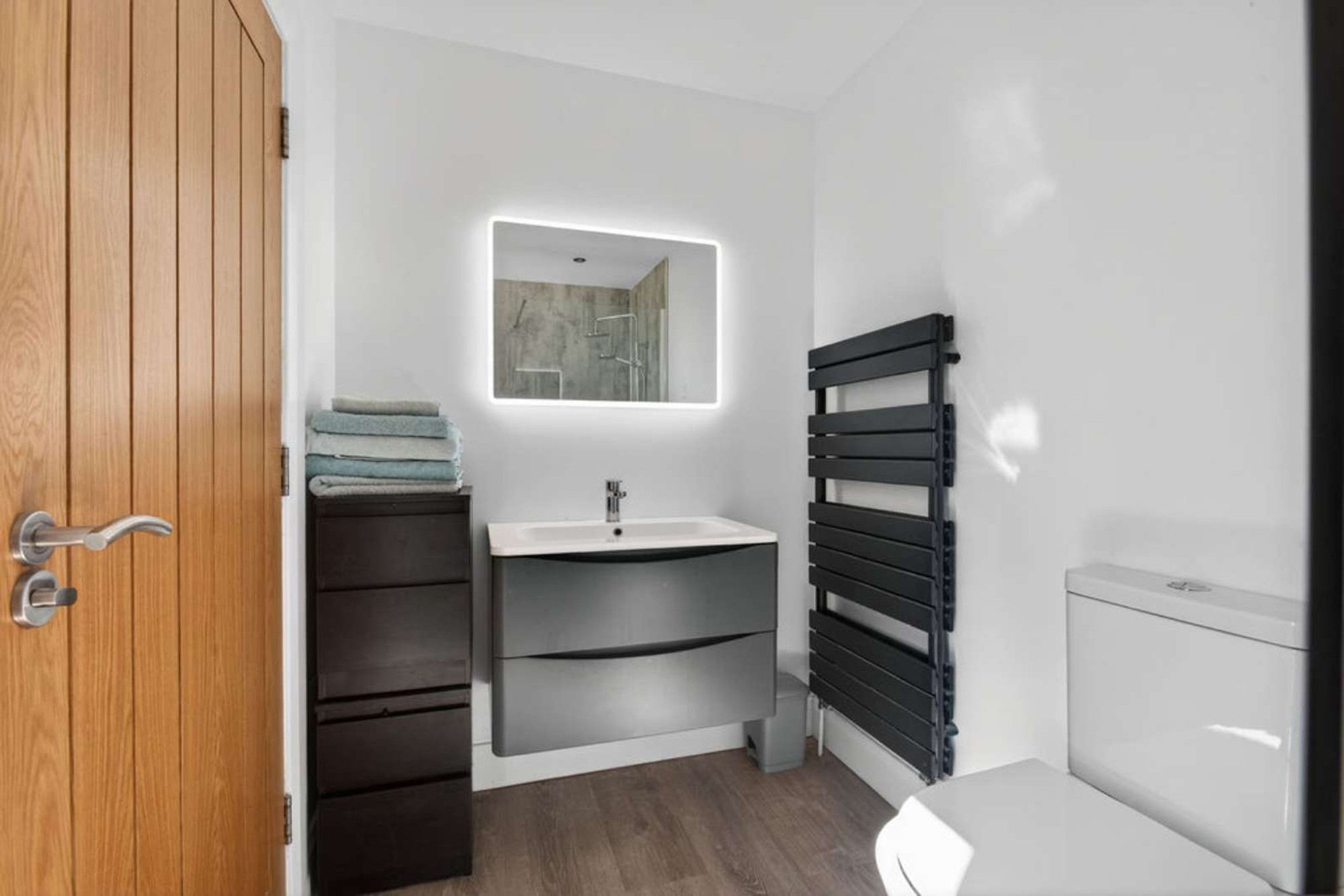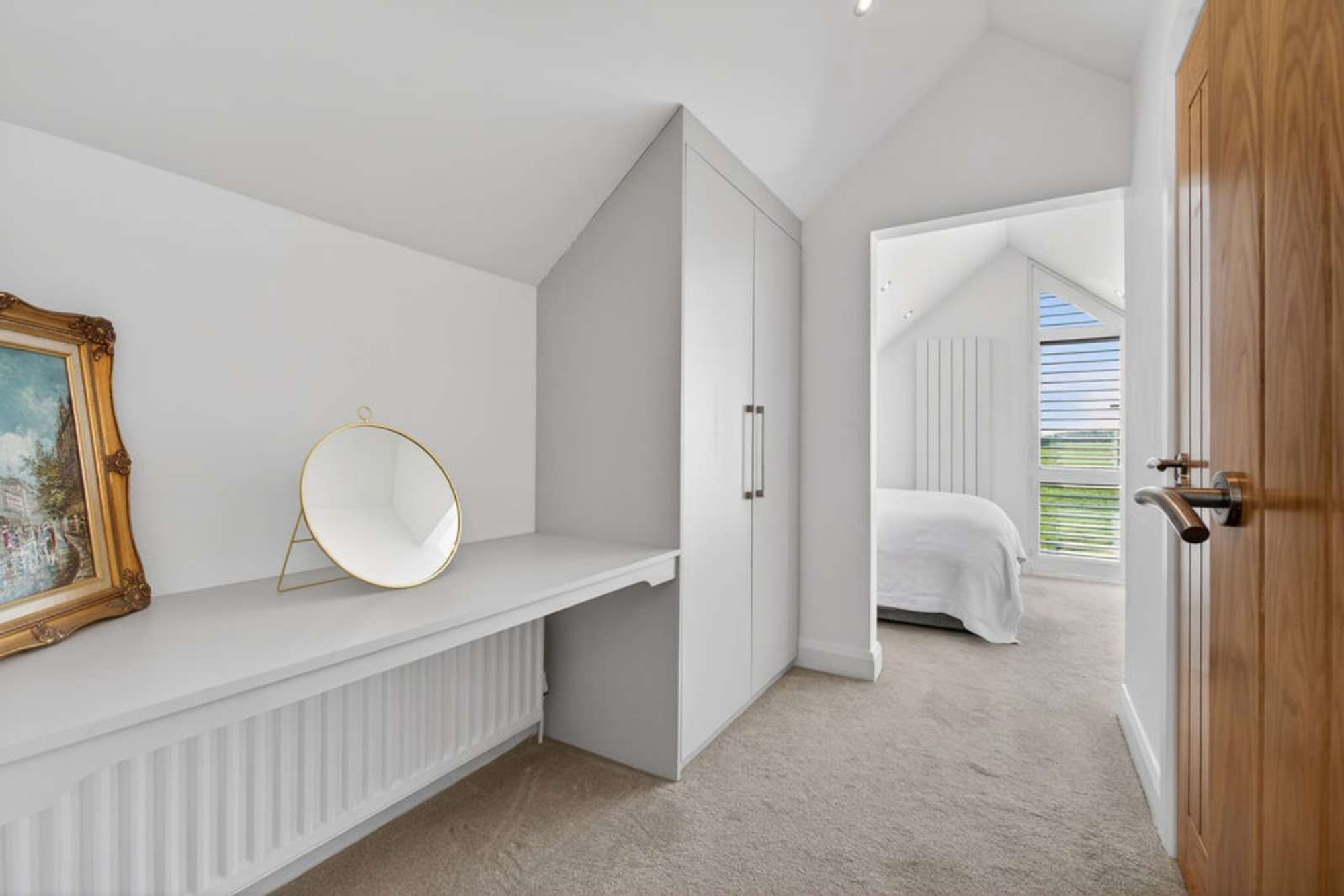 A feel good upper floor master bedroom with a vaulted ceiling and recessed spotlights, wall mounted contemporary radiator; dressing room area with a double wardrobe and dressing table and an Ensuite including a w.c with a concealed cistern/ vanity unit and storage below, heated towel rail and a spacious shower cubicle with a mixer shower including a flexible hand shower attachment.