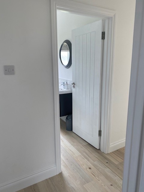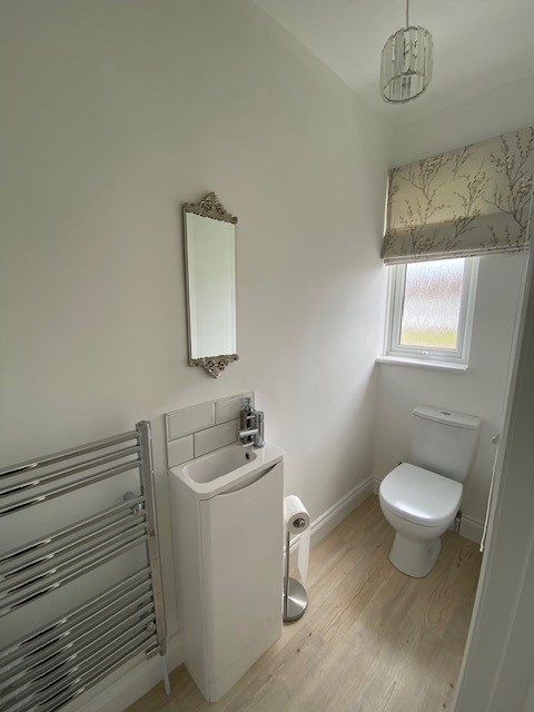 With WC, wash hand basin with tiled splashback, chrome heated towel rail and Karndean flooring.