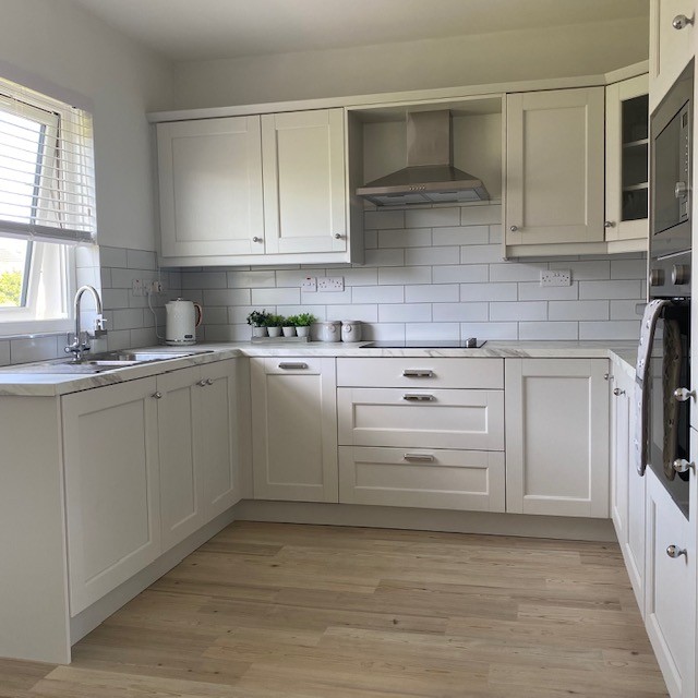 With range of eye and low level units, tiled around worktops, Karndean flooring, stainless steel extractor fan, "Beko" electric hob, built in "Hotpoint" microwave, built in eye level "Beko" oven, space for washing machine & tumble dryer combi, built in slim "Kenwood" dishwasher, 1 1/2 stainless steel sink unit, concealed underlighting and illuminated display cabinet.