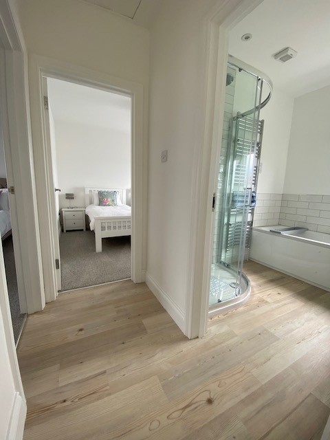With bath, floating wash hand basin, fully tiled walk-in mains shower cubicle, Karndean flooring, chrome heated towel rail, recessed ceiling lights, extractor fan, half tiled walls and shaver point.