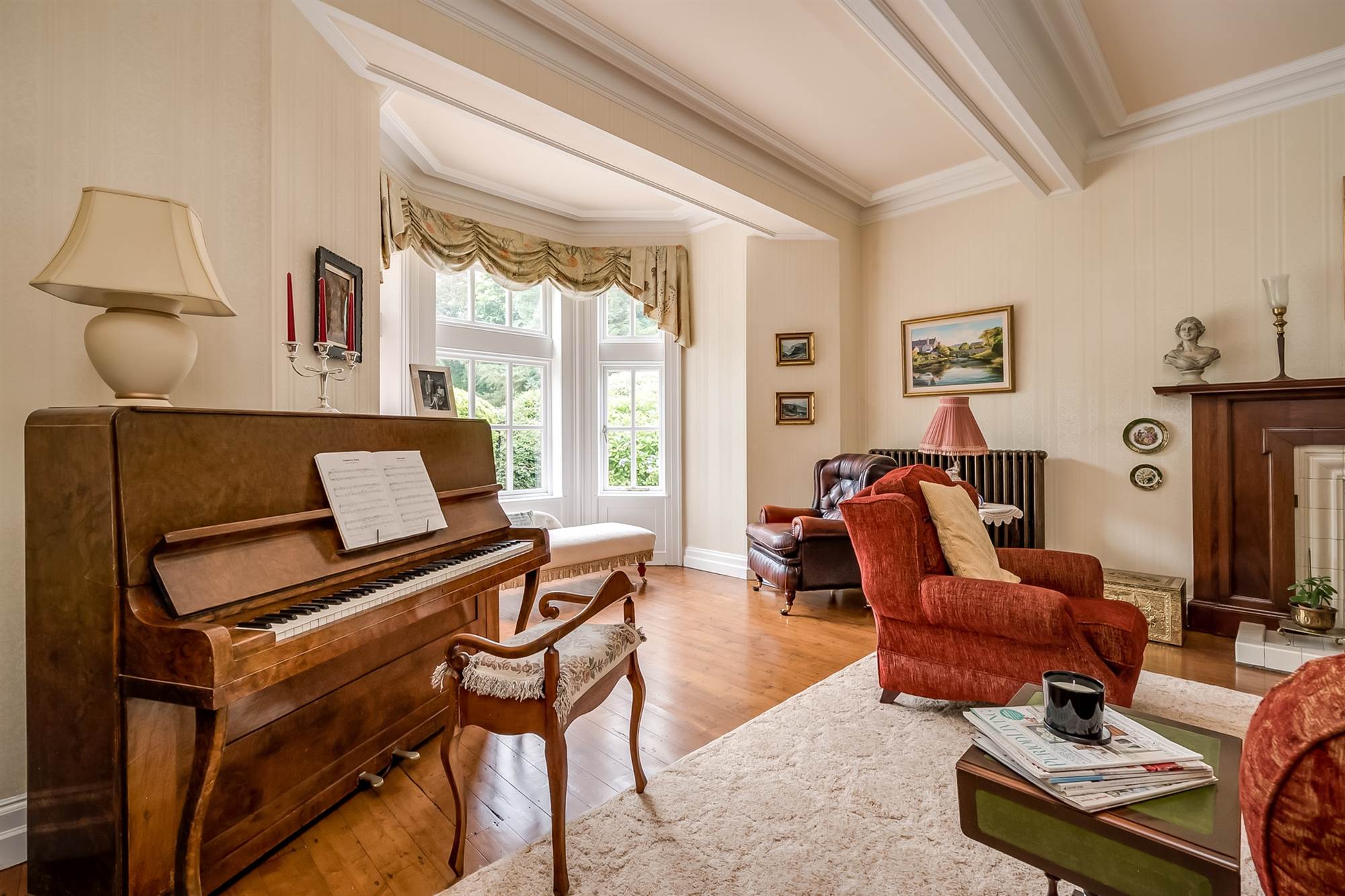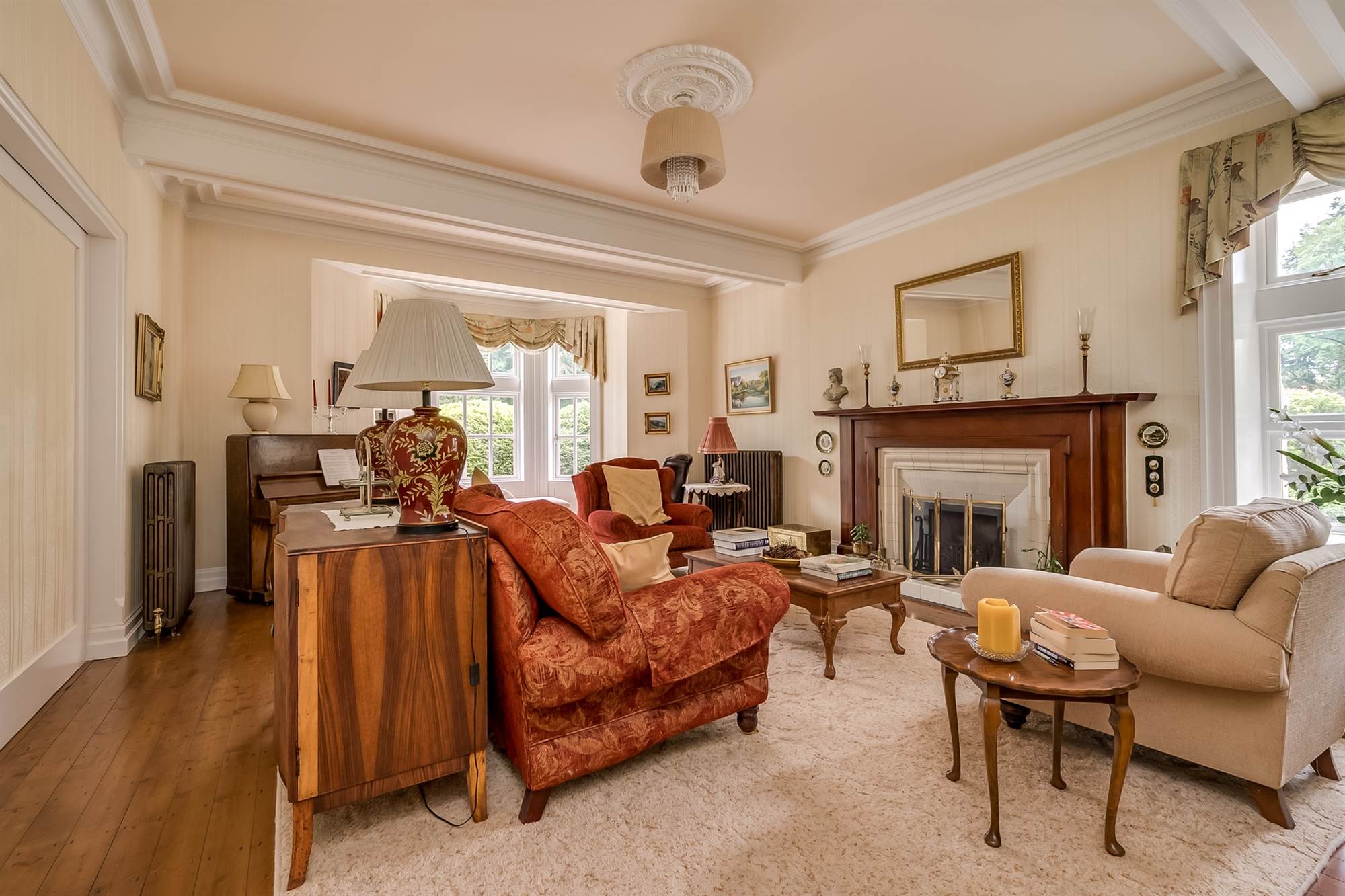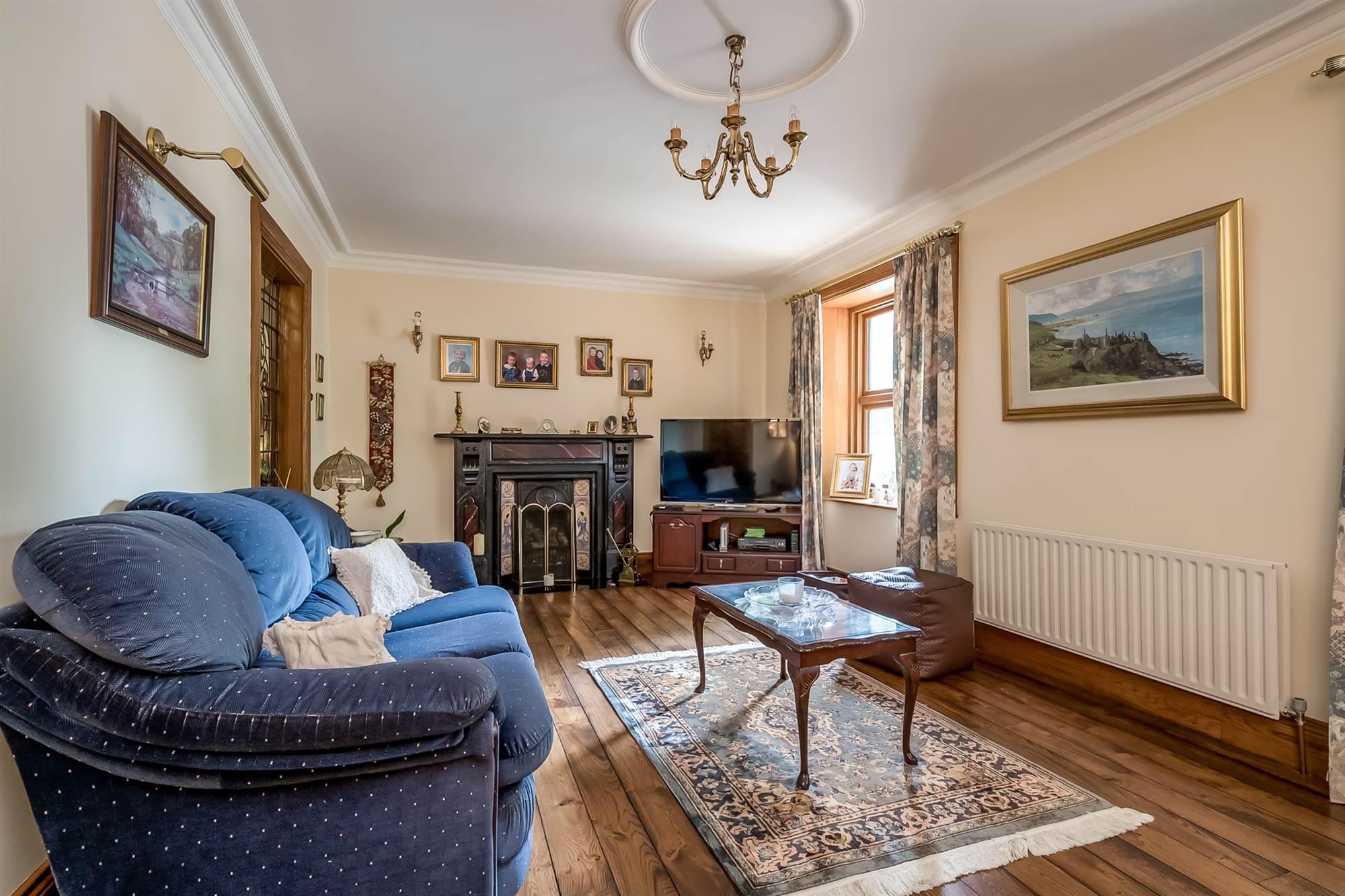 Feature natural wood flooring, cornice ceiling, feature polished marble fireplace surround with cast iron inset,decorative tile inlay and open fire.