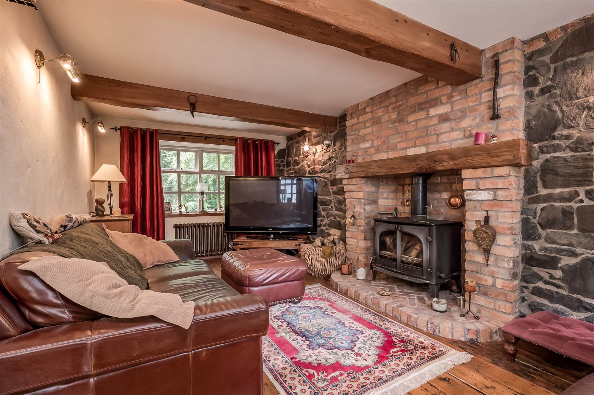 Feature wood burning stove, solid wood flooring, brick chimney breast, hearth and mantle.