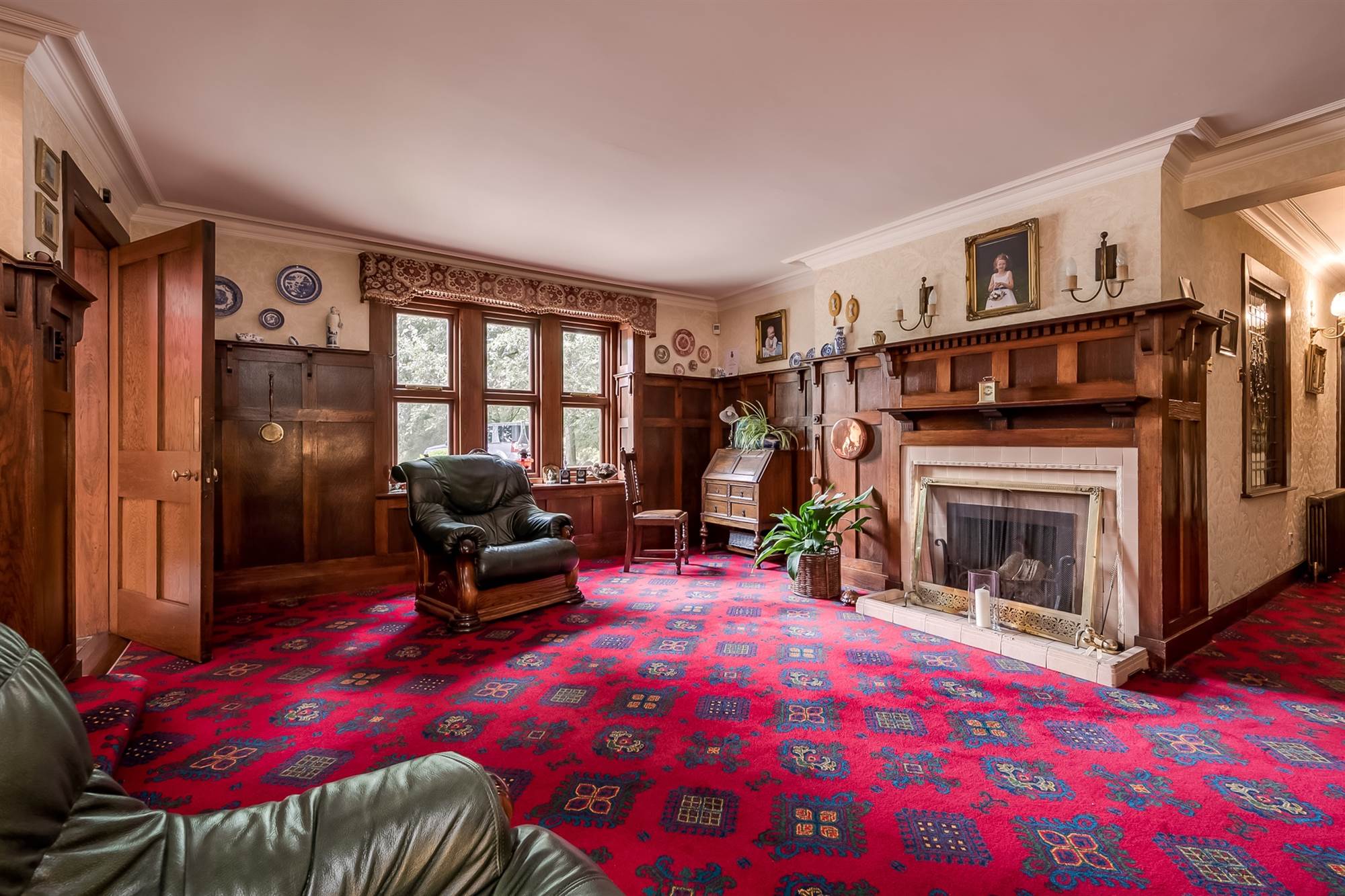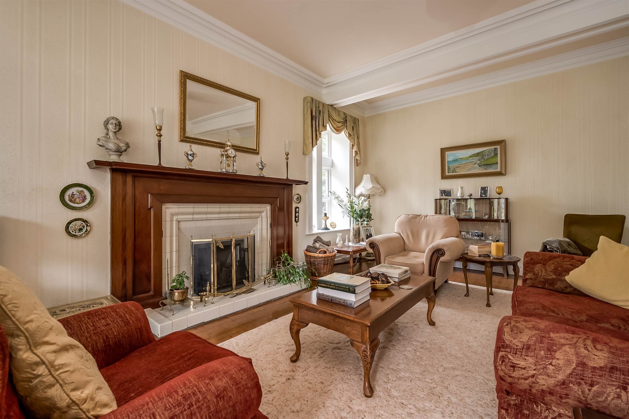 Wood panelled walls incorporating fireplace surround and mantle, tiled inset and hearth, cornice ceiling.