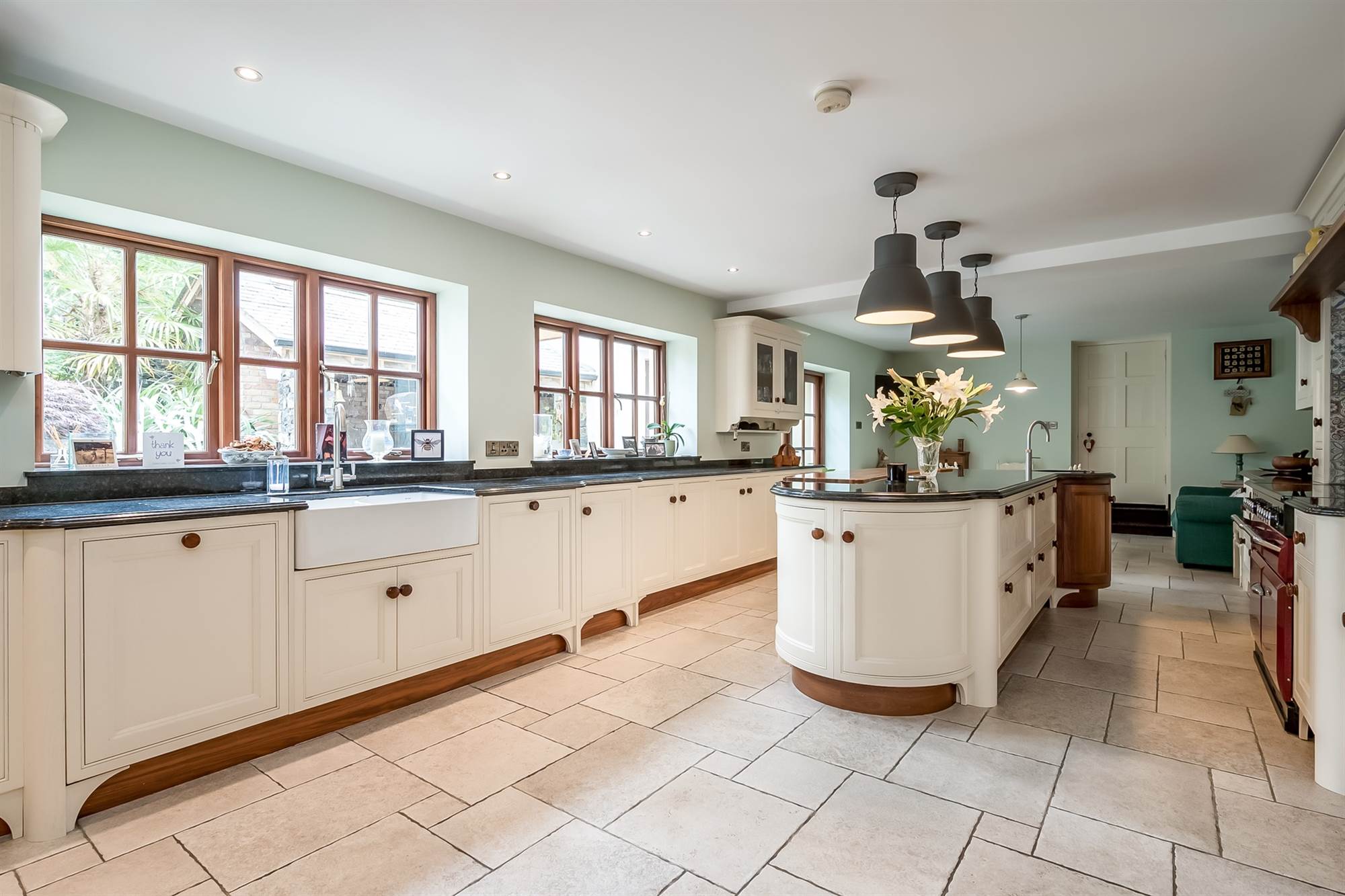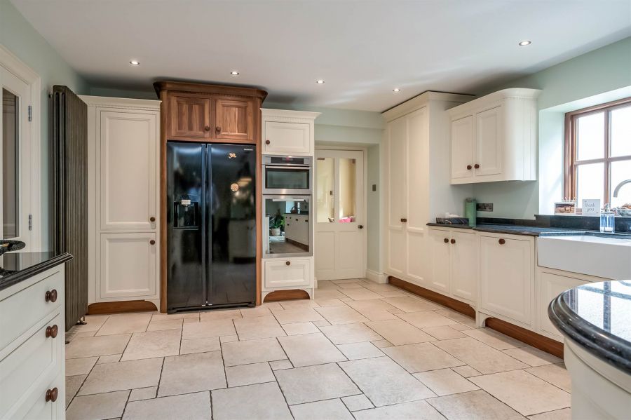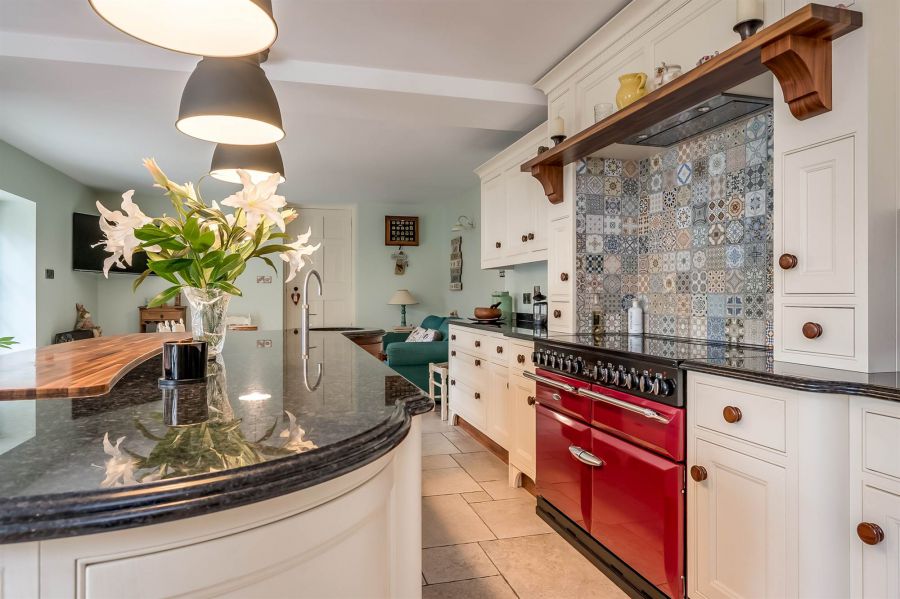 Exceptional range of modern high and low level units, polished granite work surfaces, impressive island unit with polished work surface, integrated hardwood dining area on island unit, Stanley range with double oven, grill, five ring ceramic hob, under unit lighting, twin bowl enamel Belfast sink unit with mixer tap and double drainer, plumbed for American fridge freezer, larder unit, ceramic tiled floor, dining area, low voltage spotlights.