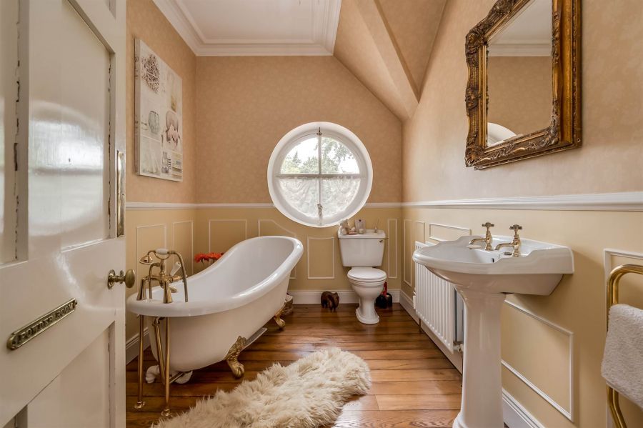 Roll top bath, low flush wc, pedestal wash hand basin, sanded and varnished floor, circular window.