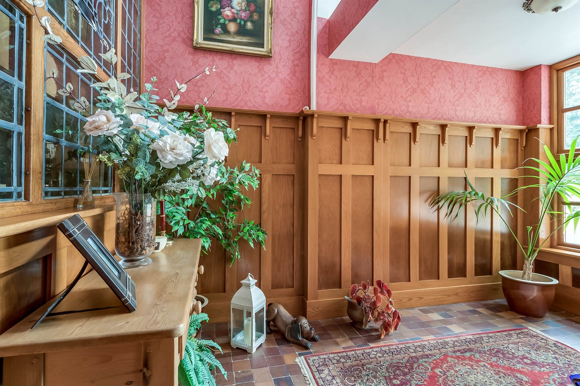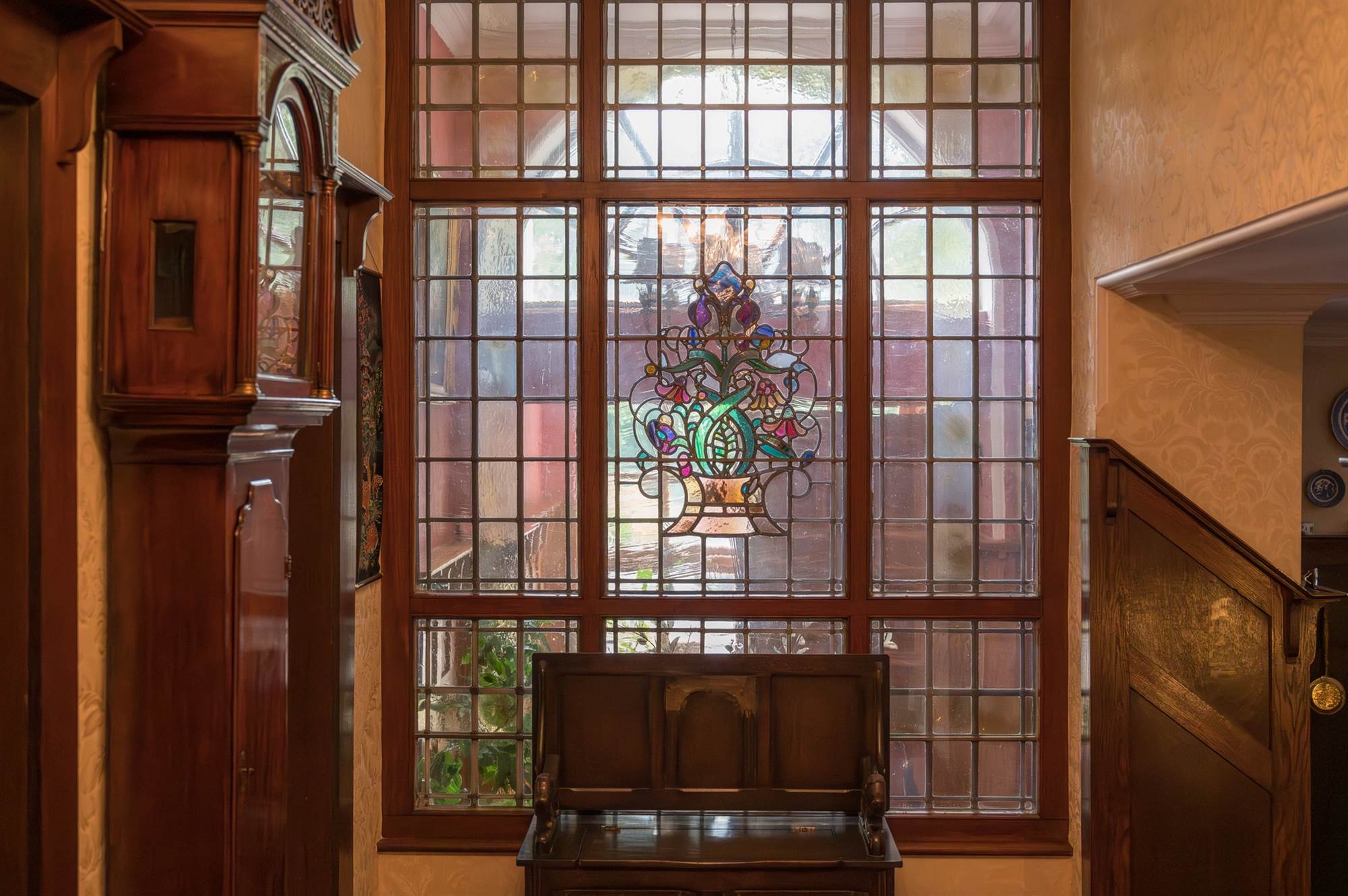 Cloakroom with low flush wc, wash hand bsin, cloaks area, stained and leaded glass door to outside.