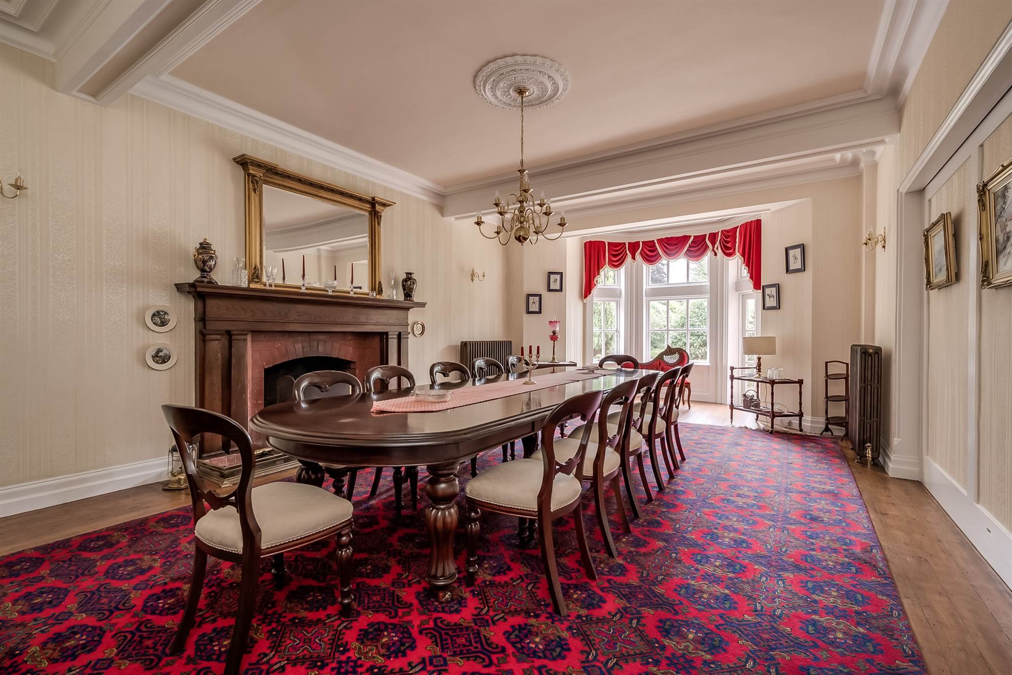 Feature firepalce surround and mantle, brick inset, open fire, brick hearth, French door to south facing veranda, cornice ceiling, ceiling rose, natural wood flooring.
