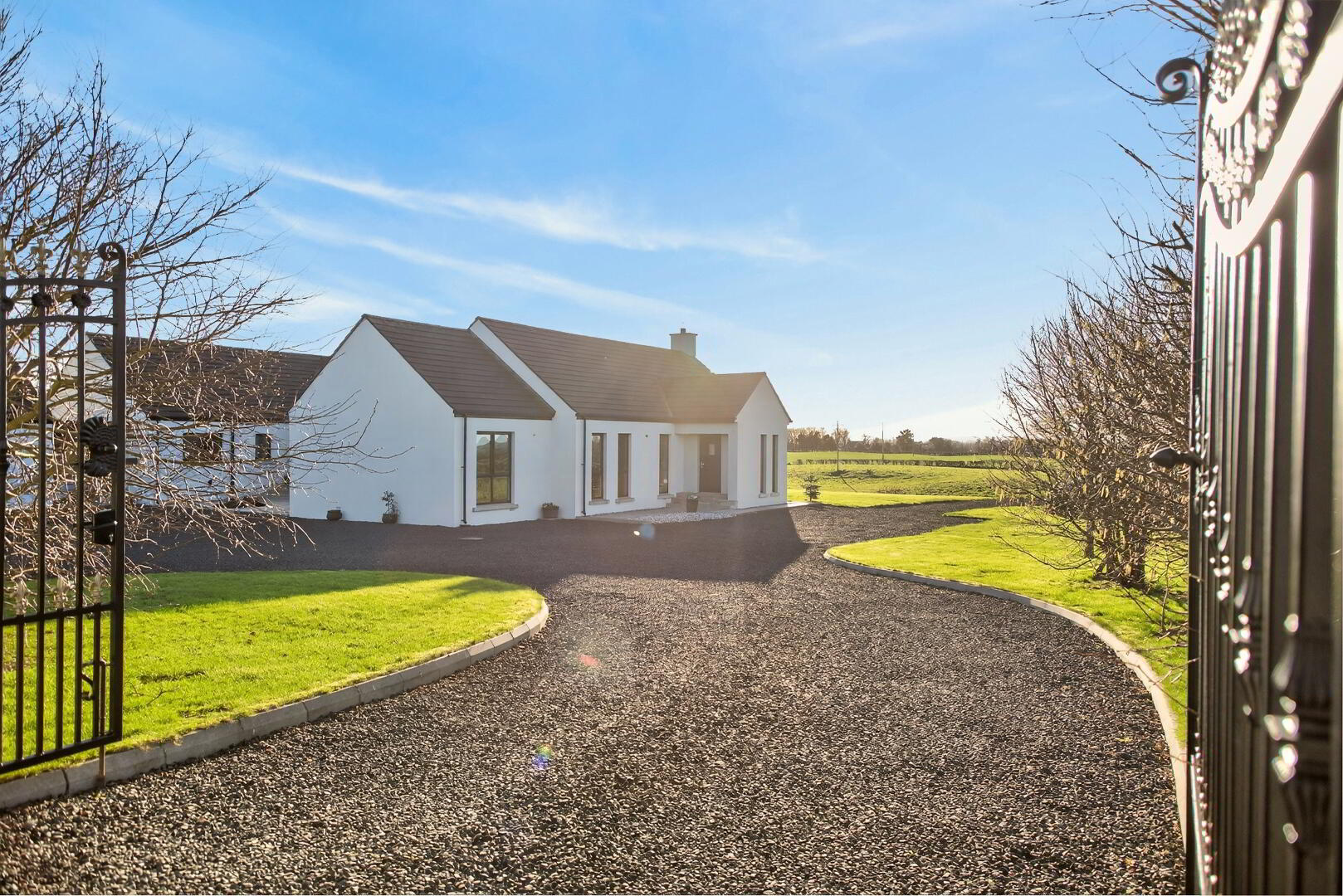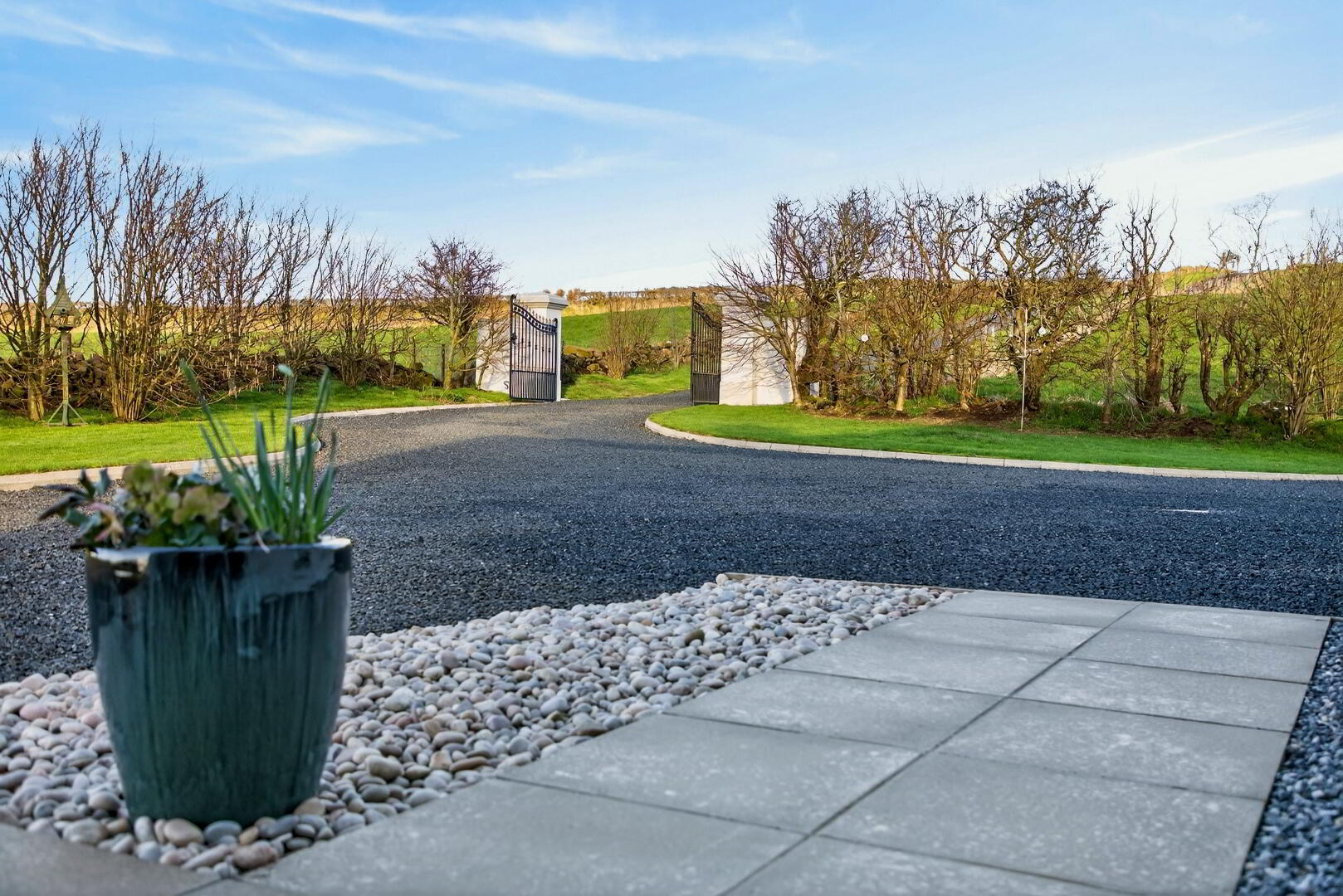 Shared access from road to entrance pillars with K Scroll gate and leading to private driveway entering through pillars and K Scroll gates to grounds