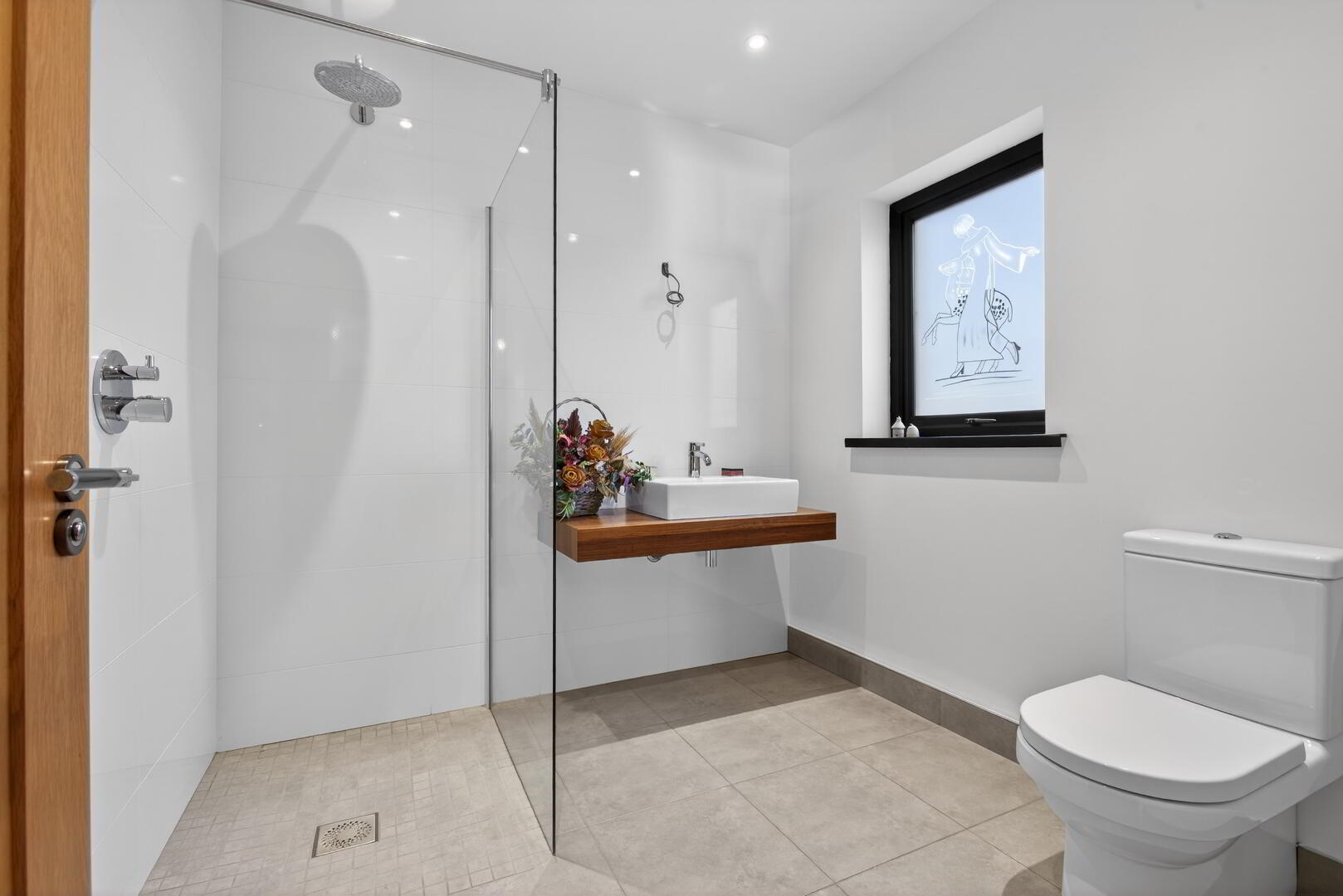 With walk in fully tiled shower cubicle and shower unit off mains featuring drench head, floating mantel with counter top basin and Villeroy and Bosch mixer tap, floor to ceiling splashback tiling, wiring left for mirror, back to wall low flush wc, heated towel rail, integrated LED spotlights