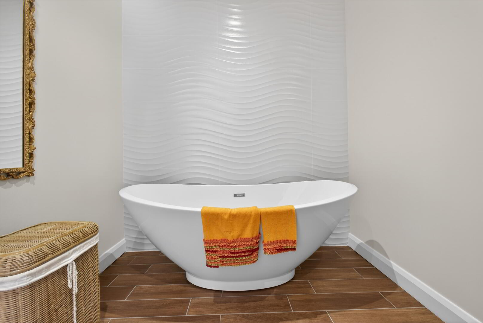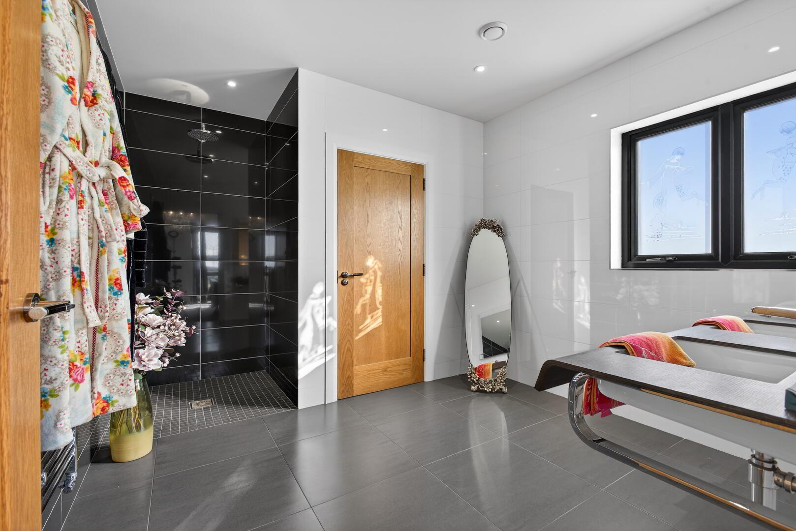 Comprising freestanding oval bath with tiled backdrop, open shower cubicle, fully tiled with shower unit off mains, heated towel rail, separate wc with back to wall low flush wc, wall hung Duravit basin and mixer tap, integrated LED spotlights
