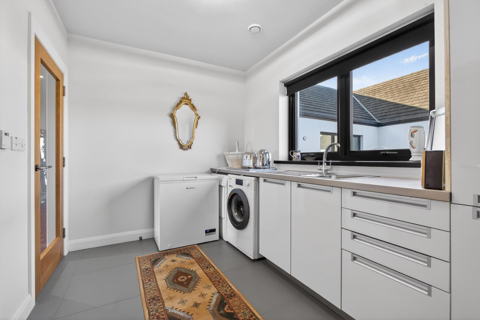 Fitted range of cupboards with recessed handles and including space for washing machine and tumble dryer, Blanco stainless steel single drainer sink unit and mixer tap, cloaks cupboard, door to exterior