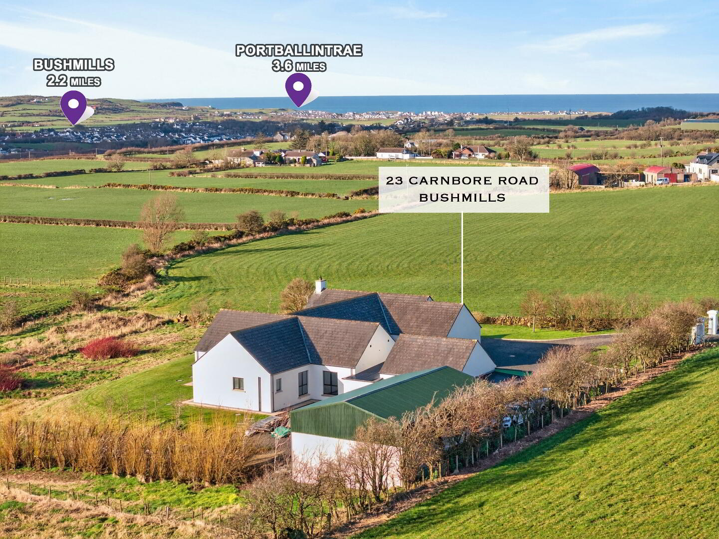 Nestling within the beautiful countryside just over 2 miles from the historic village of Bushmills, this stylish and contemporary detached 4/5 bedroom single storey residence offers a spacious and well-proportioned level of accommodation presented and maintained to a superb standard.