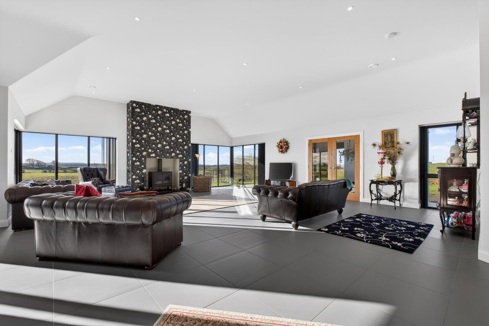 Internally, tiled flooring is featured throughout much of the property enhanced with underfloor heating with carpeted flooring to the bedrooms, oak finish internal doors and a beam vacuum system. The focal point of this unique home is without doubt the open plan living/dining and kitchen area which encompasses a fitted Poggenpohl range of cabinetry complimented with Birch effect finishes, granite and Bosch integrated appliances with an island unit for more casual dining. An inglenook fireplace with a Stovax freestanding stove which is linked into the hot water system, offers a welcoming draw for colder days and nights with corner aspect windows to take in the views either side.