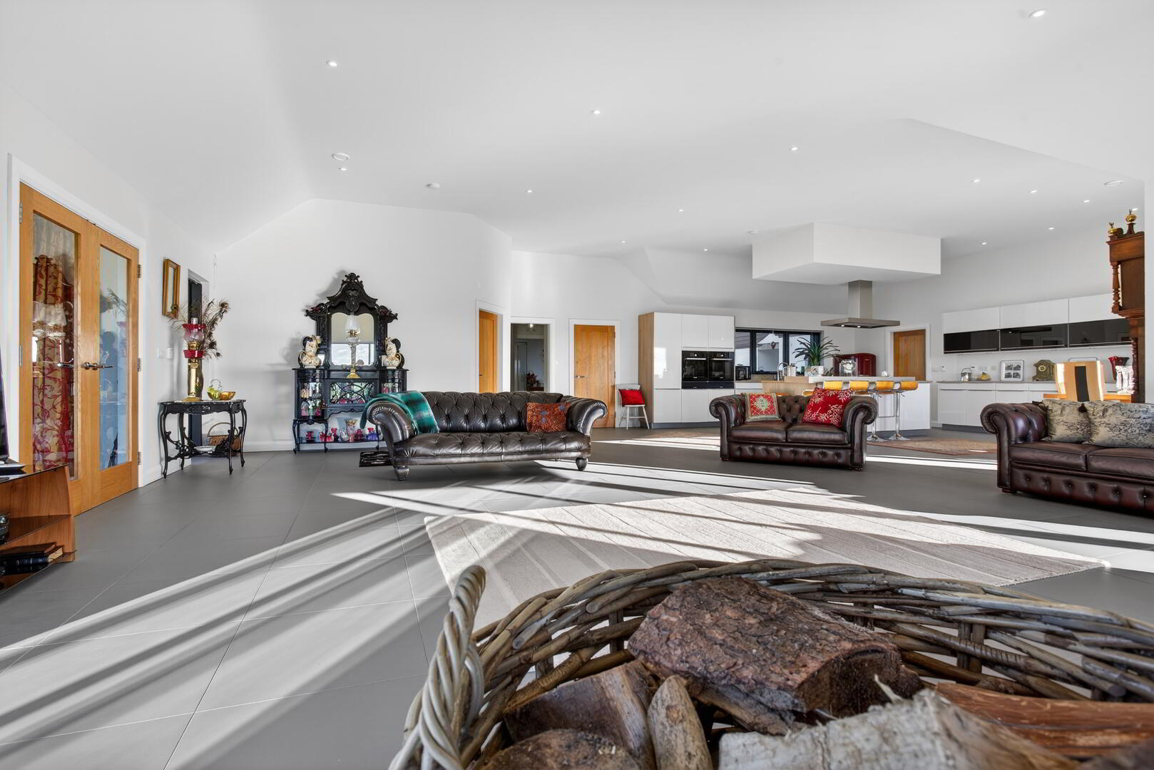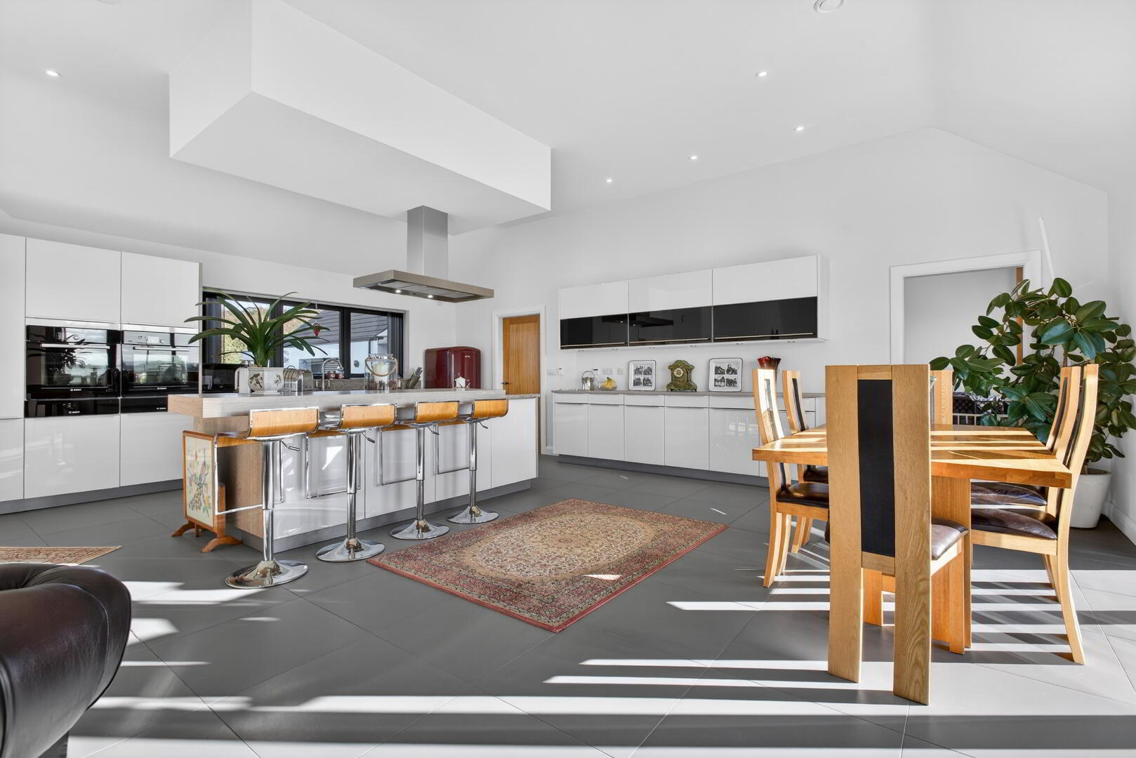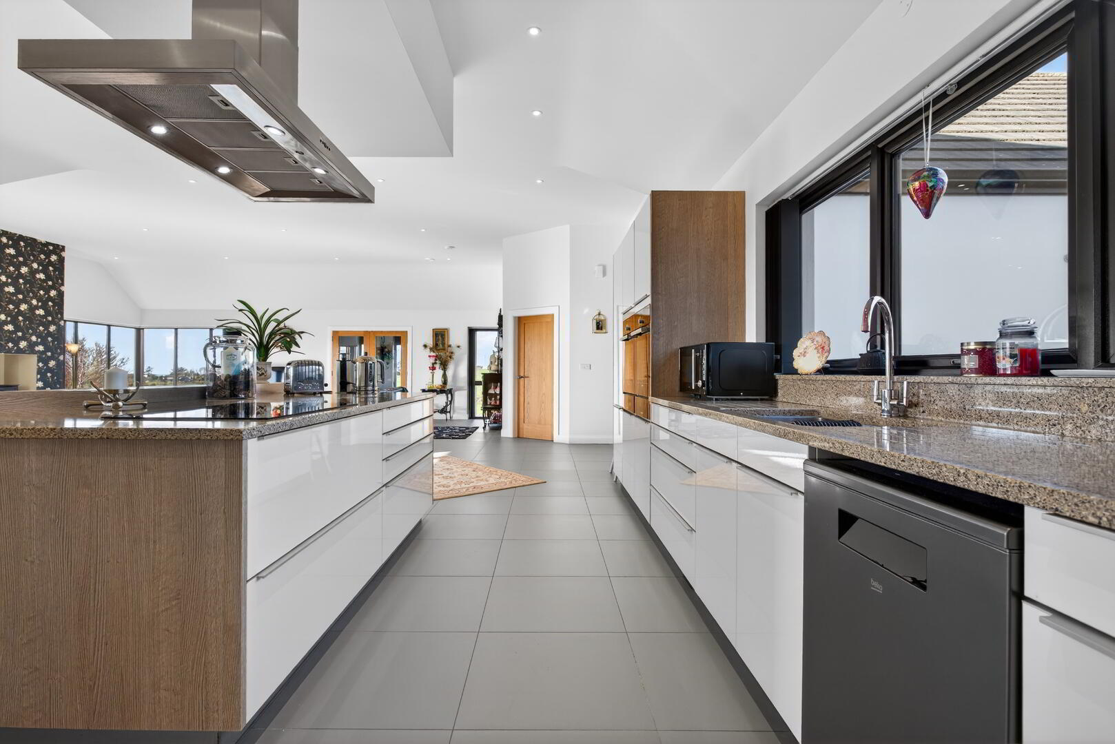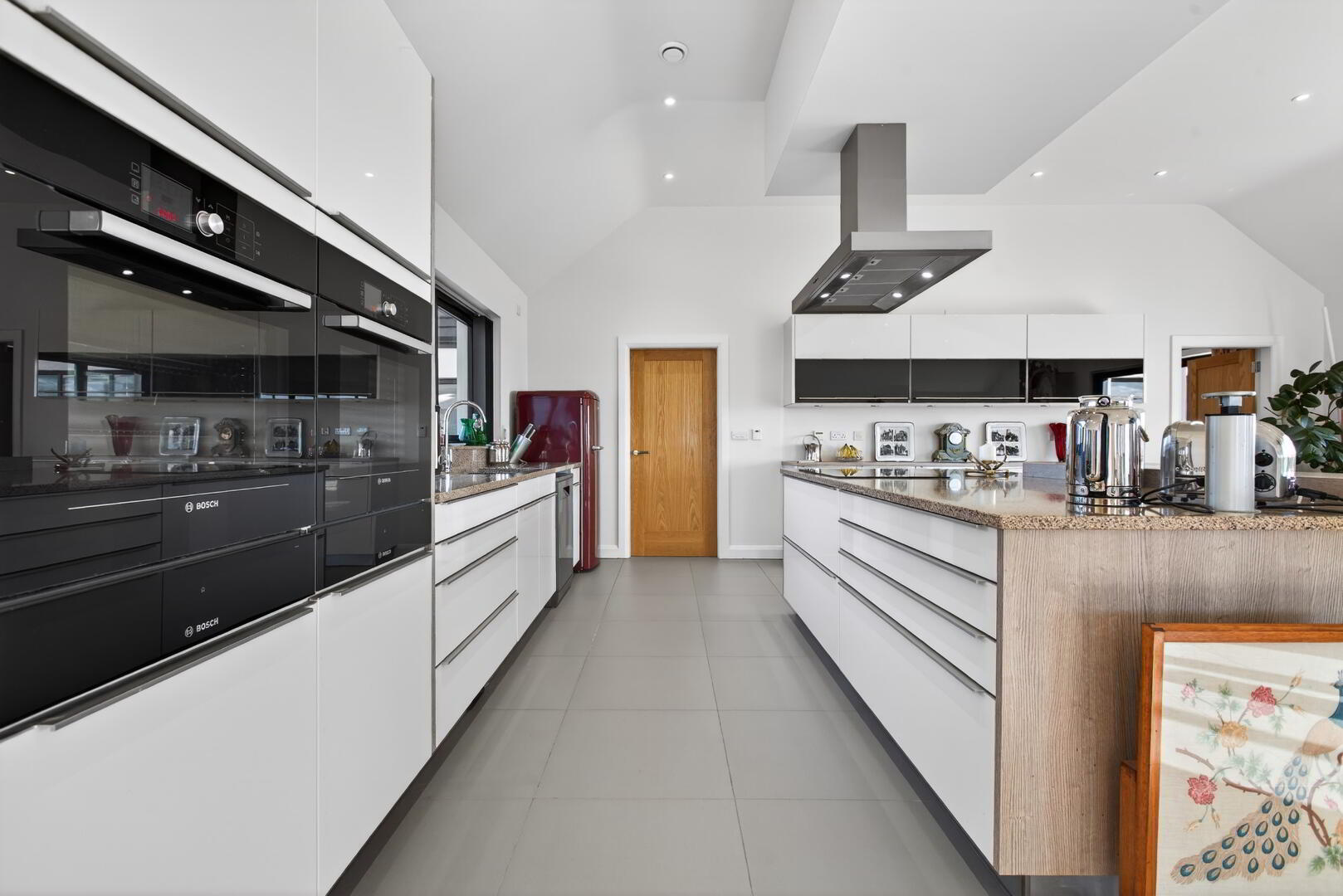 Fully fitted Poggenpohl kitchen in high gloss with slim profile handles and completed in birch effect finish work tops and vertical panels complimented with granite work surfaces and upstands and including twin Bosch eye level fan assisted ovens and grills with warming drawers below, larder cupboard with pull out racks, range of cutlery and saucepan drawers, space for dishwasher, space for freestanding fridge freezer, pull up fronted cupboards, franke inset double stainless steel sink and mixer tap with etched drainer boards to either side, island with tiered breakfast bar seating 4 with cupboards to one side, deep saucepan drawers, cutlery and utensil drawers, Bosch 4 ring induction hob, suspended overhead stainless steel canopy and extractor, pull up power point tower, under unit lighting, kick board vacuum, integrated LED spotlights, sliding doors opening out to patio area, pantry (not fitted)
