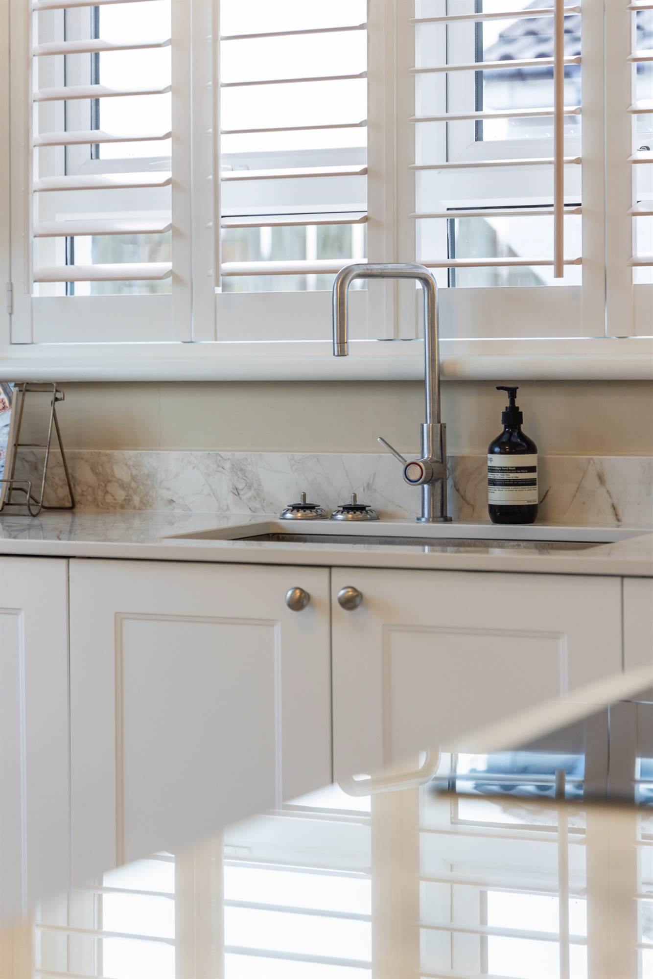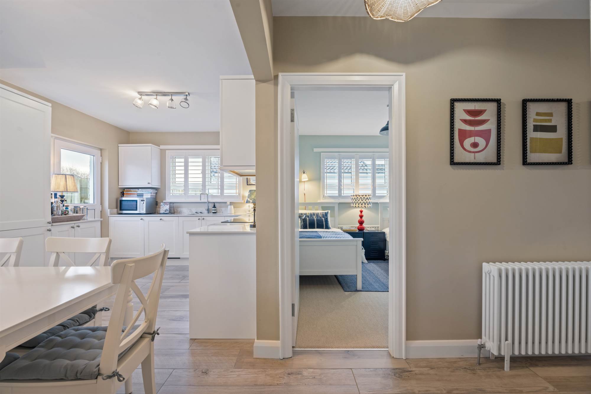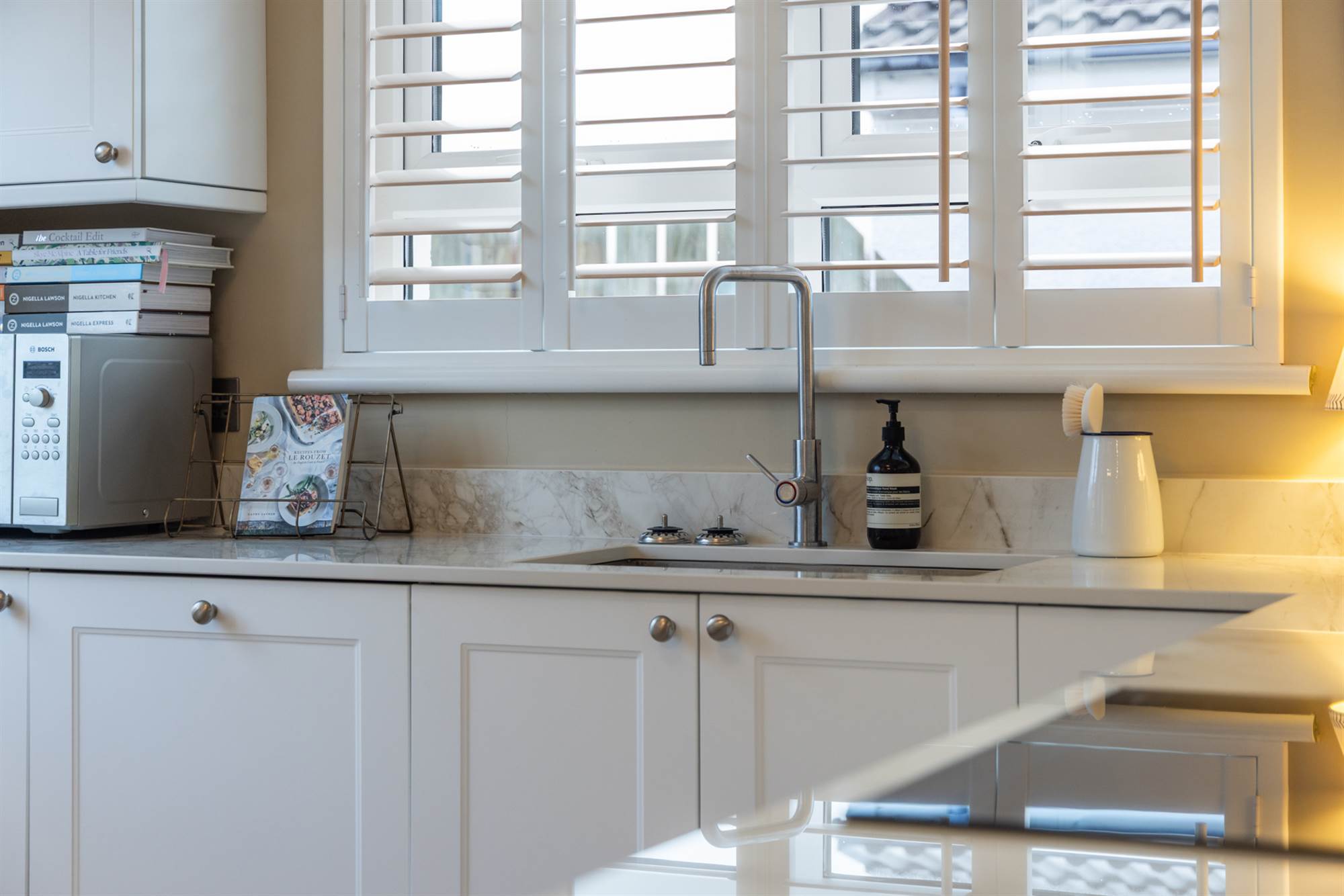 When entering the house, you can immediately see the quality of the stylish interiors with hand painted walls, tiled and elegant carpet flooring and fitted shutters. The bespoke kitchen has a range of cupboards and drawers with built in appliances, marble worktops and splashback and subtle lighting. There is a door to the rear patio gardens and BBQ area which leads to the lawn. The kitchen is open to the dining area, ideal for family or for entertaining with the living close by overlooking the front with the open fire and fitted shelving - an inviting and warm space.