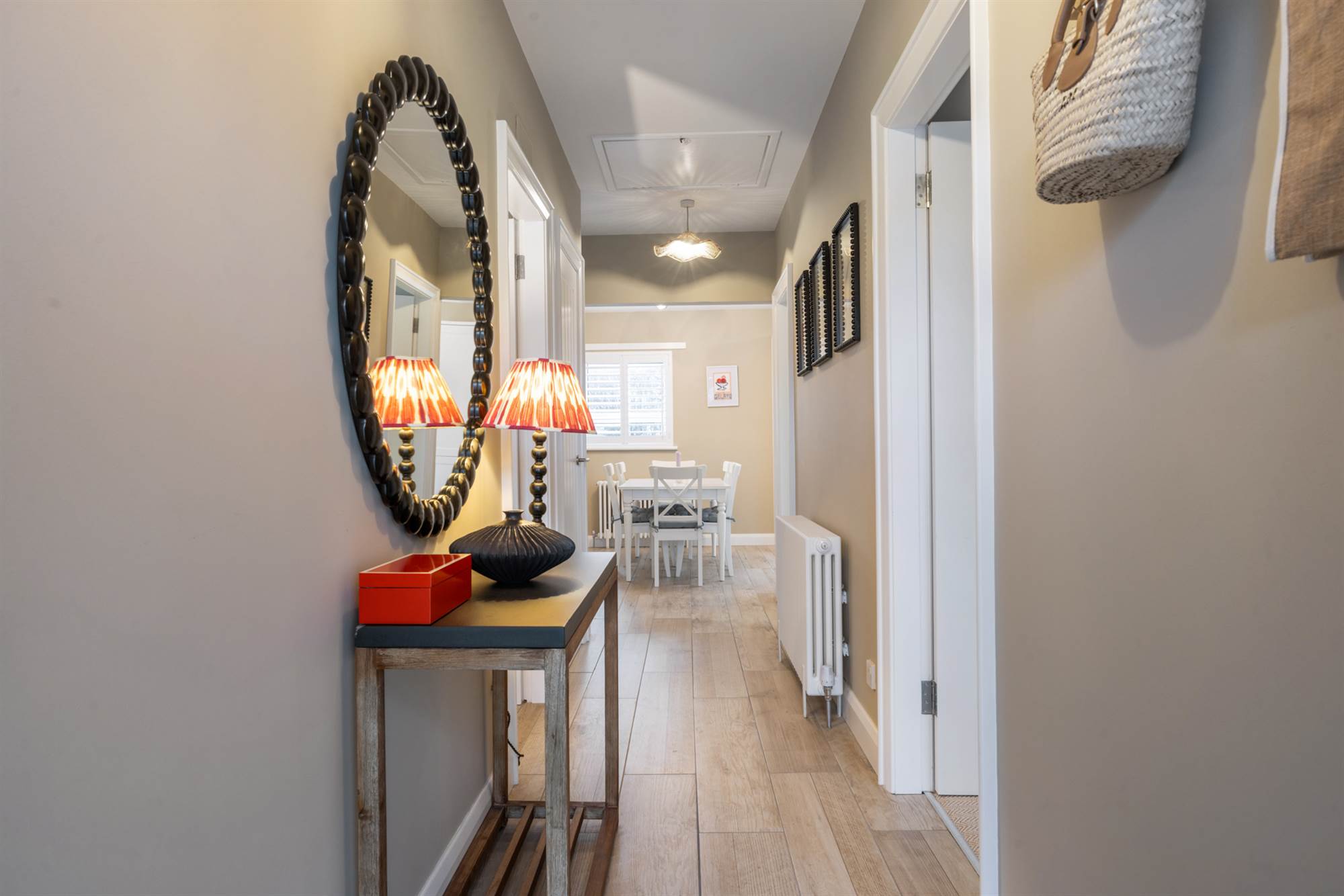 Tiled floor, walk in storage cupboard with shelving, ornate style radiator and hatch to roofspace. Hallway opens to rear hallway and kitchen/dining room.