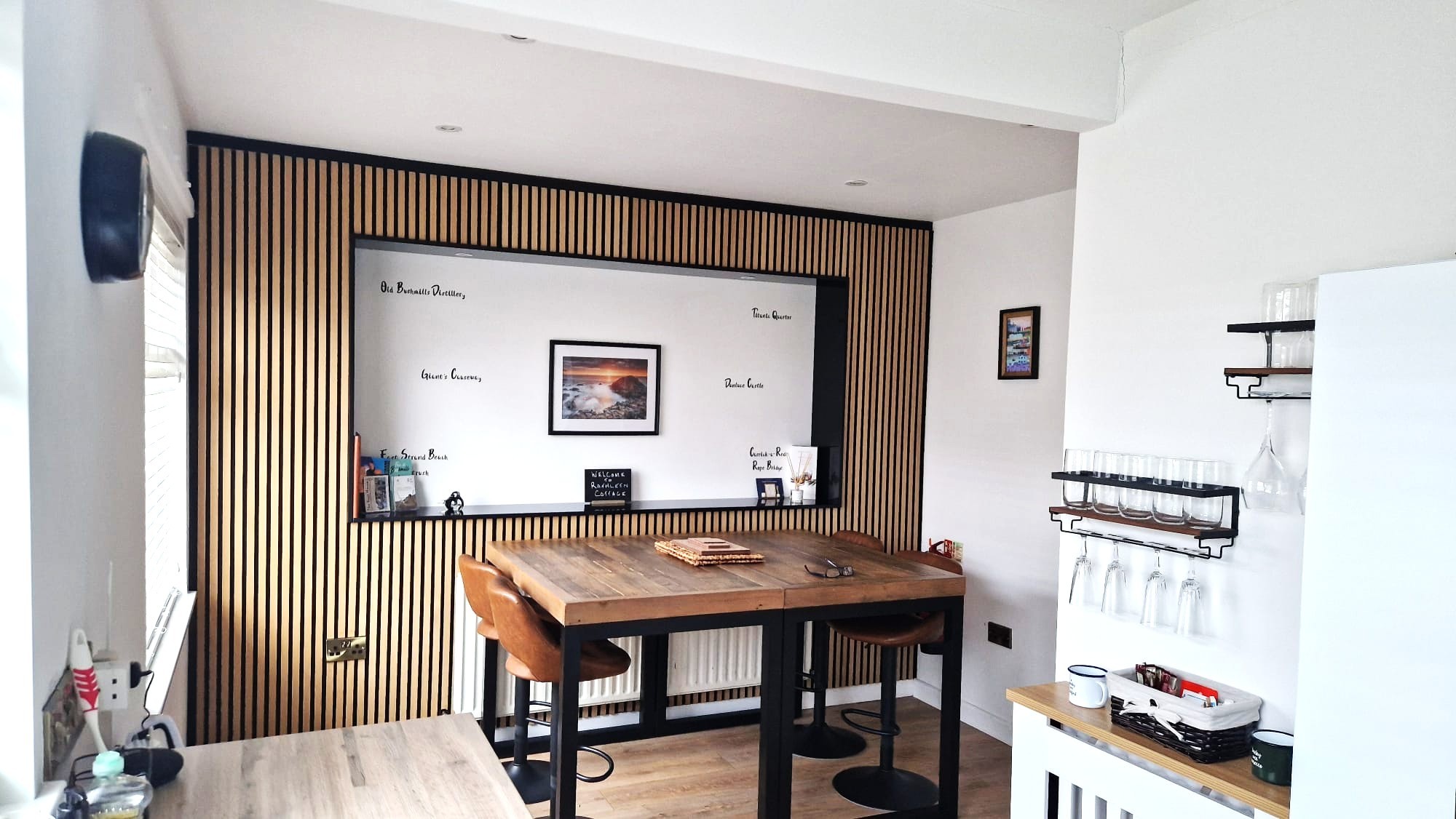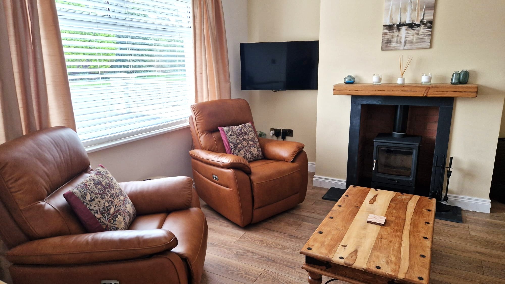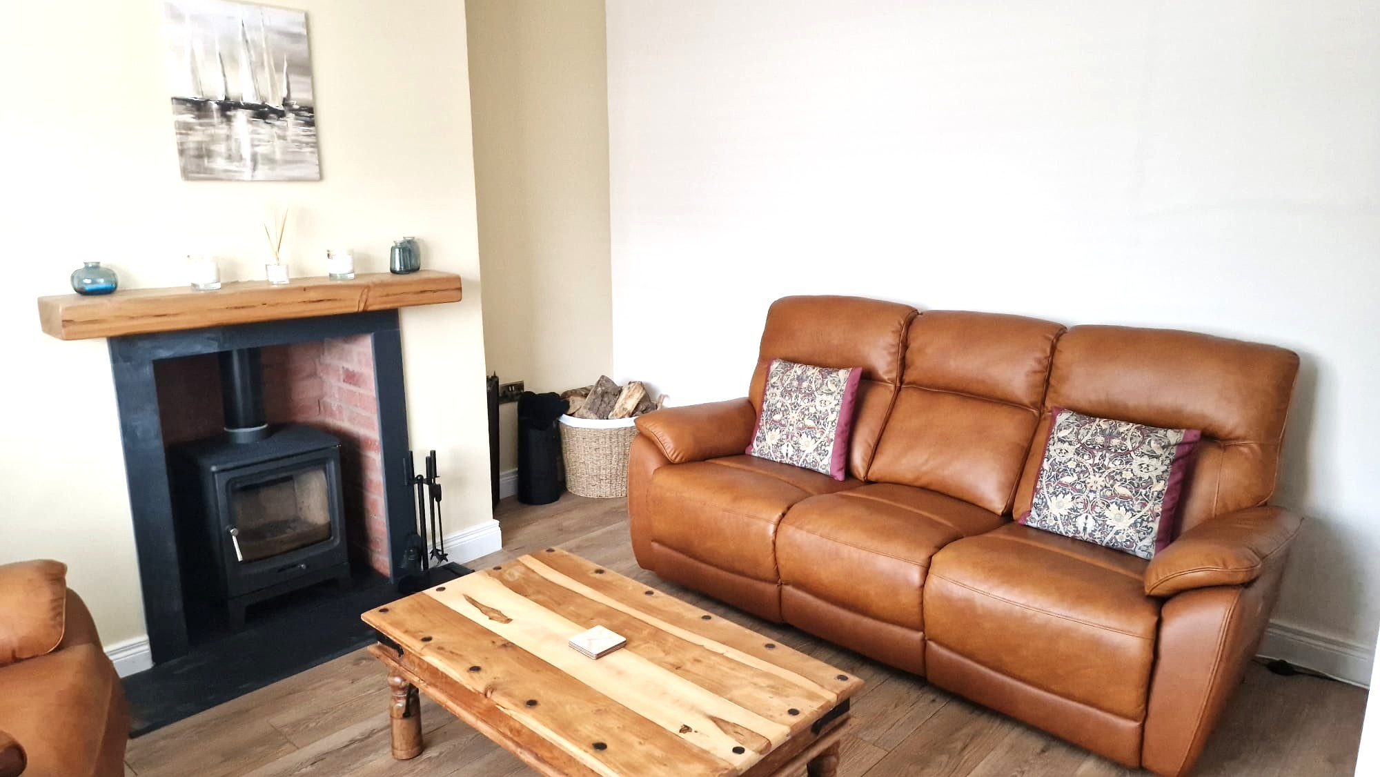 with multi fuel stove and oak beam mantel, television point and wood effect laminate flooring.