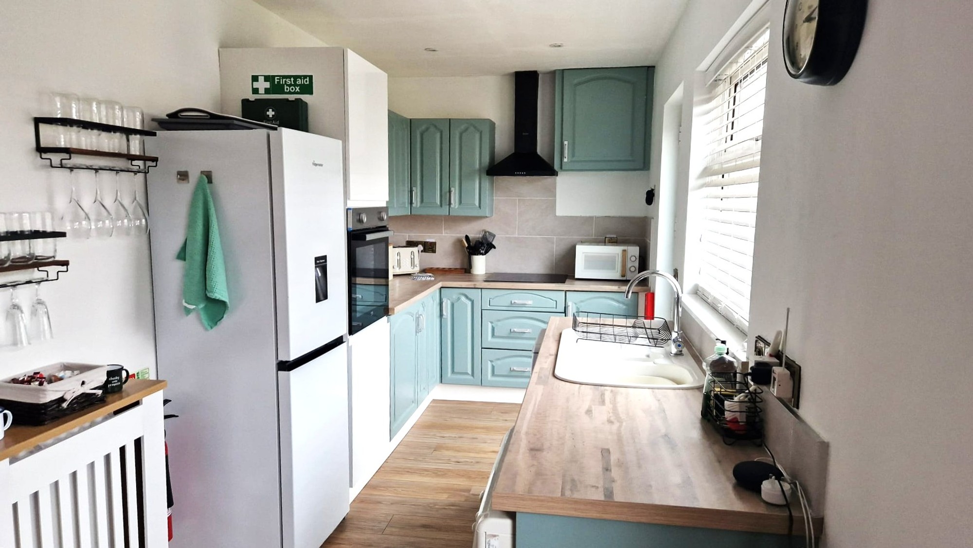 with a range of eye and low level units with matching worktops, white 1.5 sink unit, integrated ceramic hob, integrated oven, extractor fan, space for dishwasher and fridge freezer, plumbed for an automatic washing machine, part tiled walls and wooden effect laminate flooring.