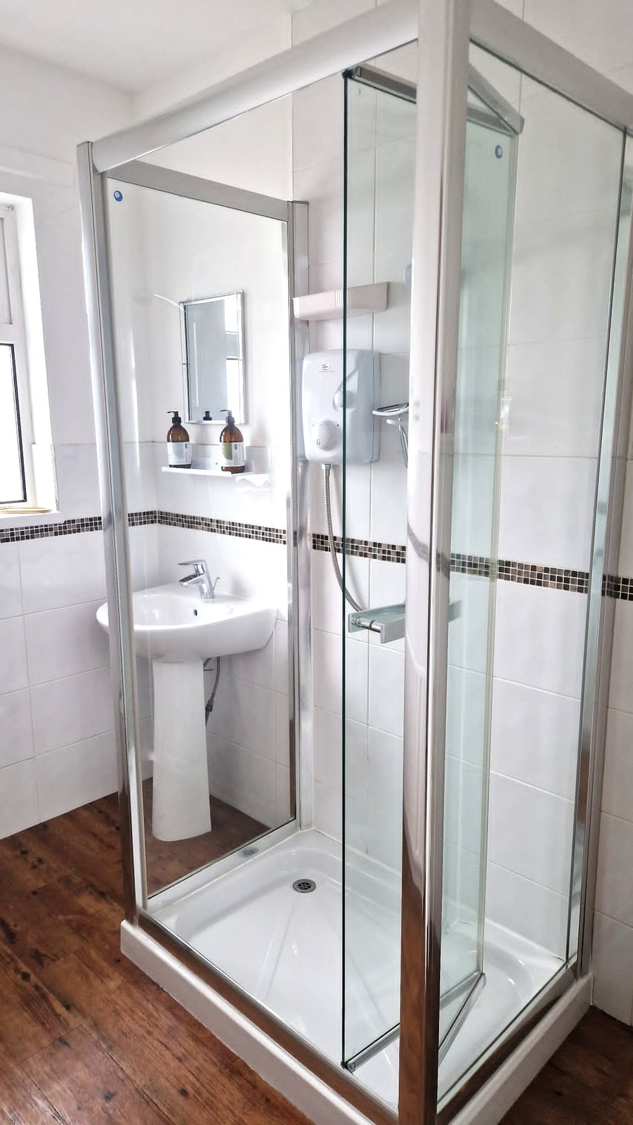 with wash hand basin, fully tiled walk in shower cubicle with electric shower, part tiled walls, extractor fan and wood effect vinyl flooring.