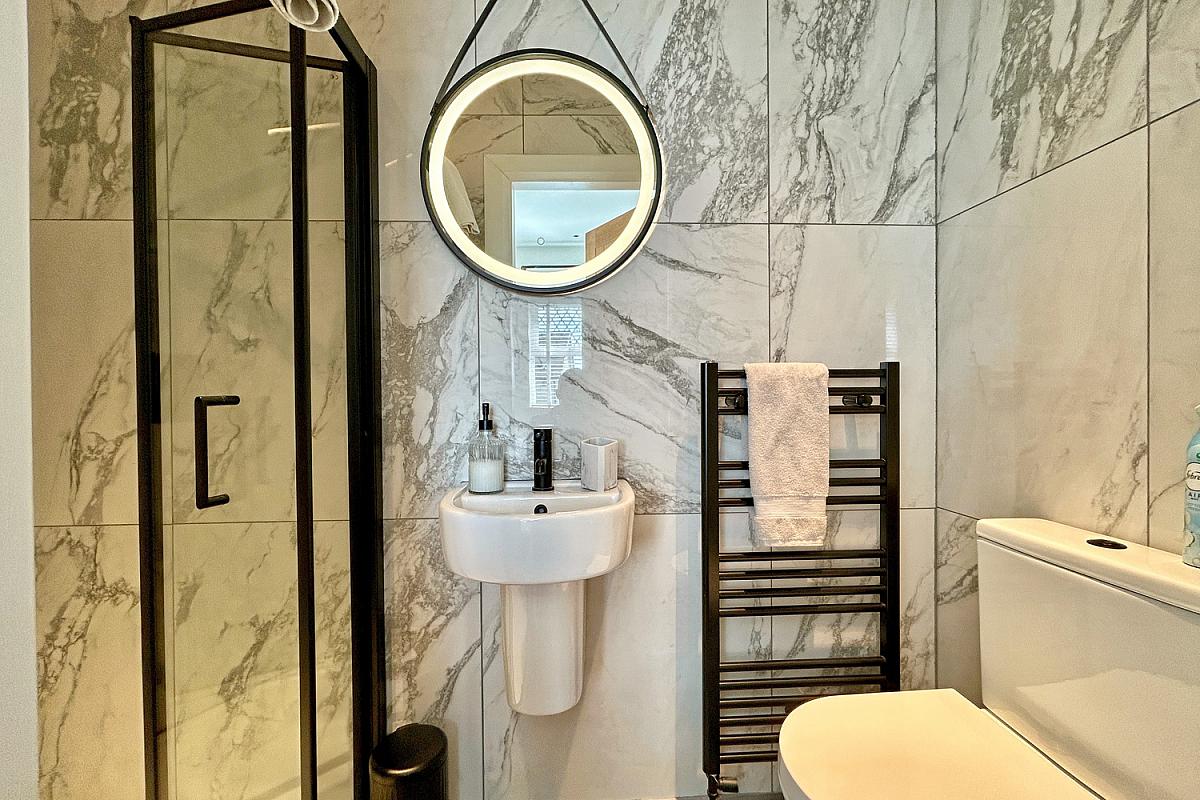 Tiled shower cubicle with rainfall head; toilet; wall mounted wash hand basin; towel radiator; backlit mirror; wood effect tiled floor; recessed motion activated lighting.
