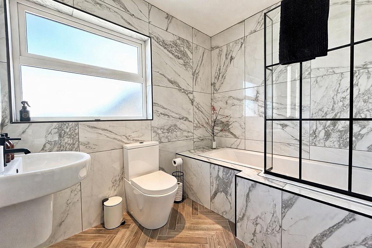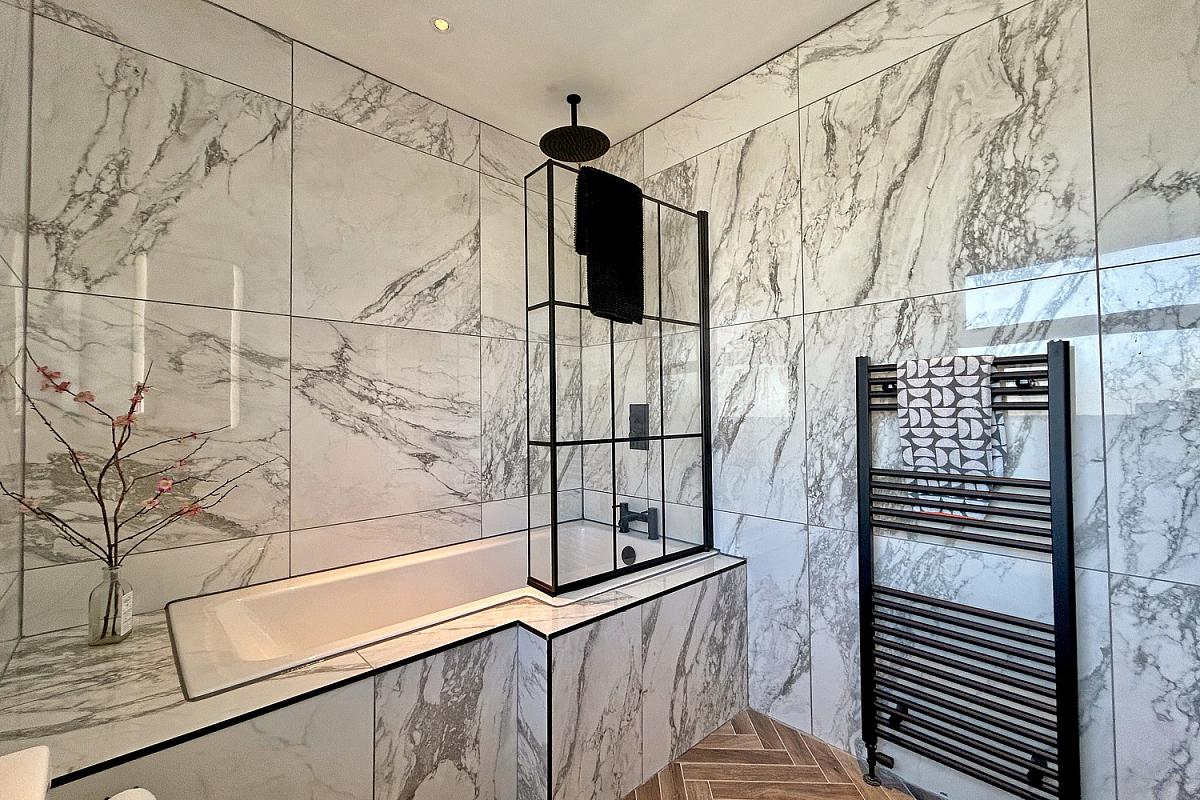 Tiled panel bath with rainfall shower; toilet; wall mounted wash hand basin; backlit mirror; towel radiator; tiled walls; wood effect tiled floor; recessed motion activated lighting.