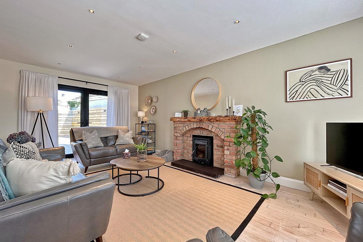 Red brick fireplace with a multi fuel stove set on a slate hearth with a wooden mantle; engineered wood floor; recessed lighting; patio doors to the rear.