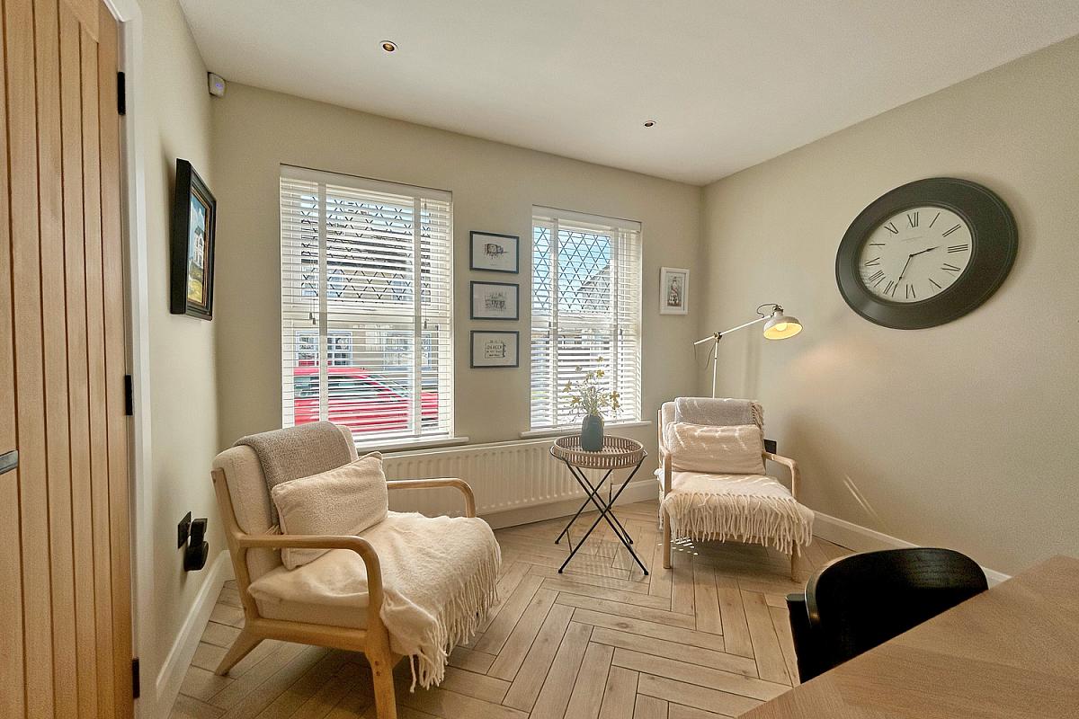 Externally, the property enjoys a private garage and a beautifully maintained rear garden designed for ease of upkeep. The garden features a generous patio area, perfect for outdoor dining, entertaining, or simply relaxing in the sun.