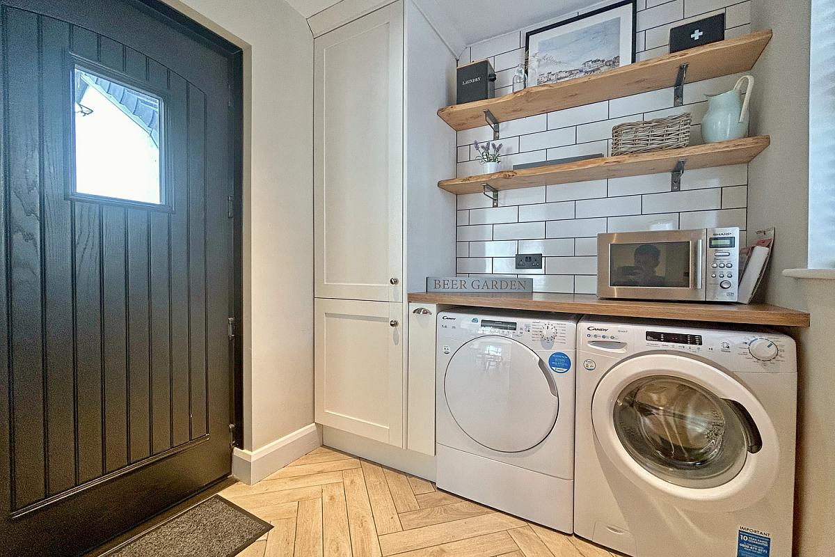Fitted bench with laminate work surface; storage cupboard with gas boiler; plumbed for washing machine; space for dryer; wood effect tiled floor; part tiled walls; recessed motion activated lighting; door to the rear.