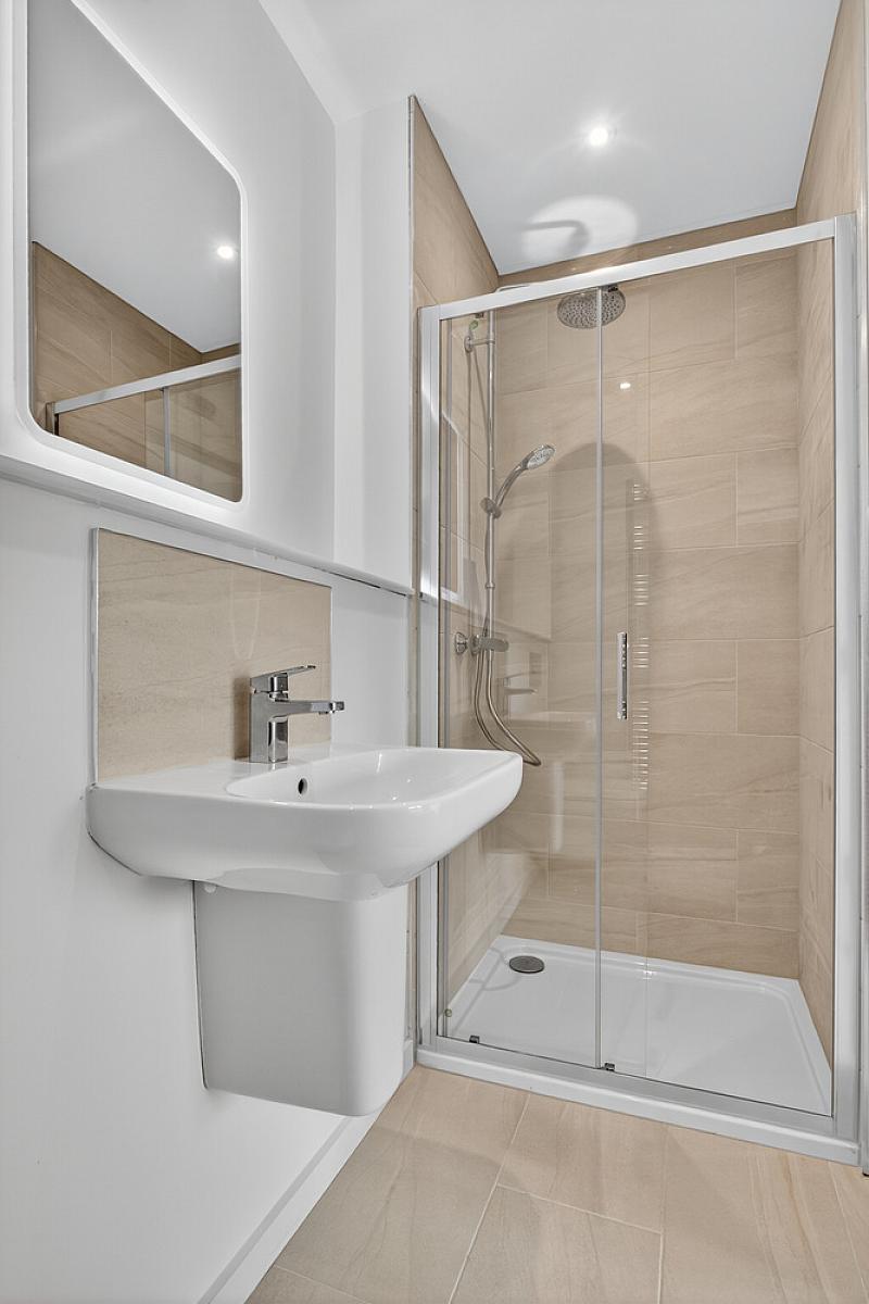 Tiled shower cubicle; toilet; wall mounted wash hand basin; chrome towel radiator; tiled flooring; part tiled walls.