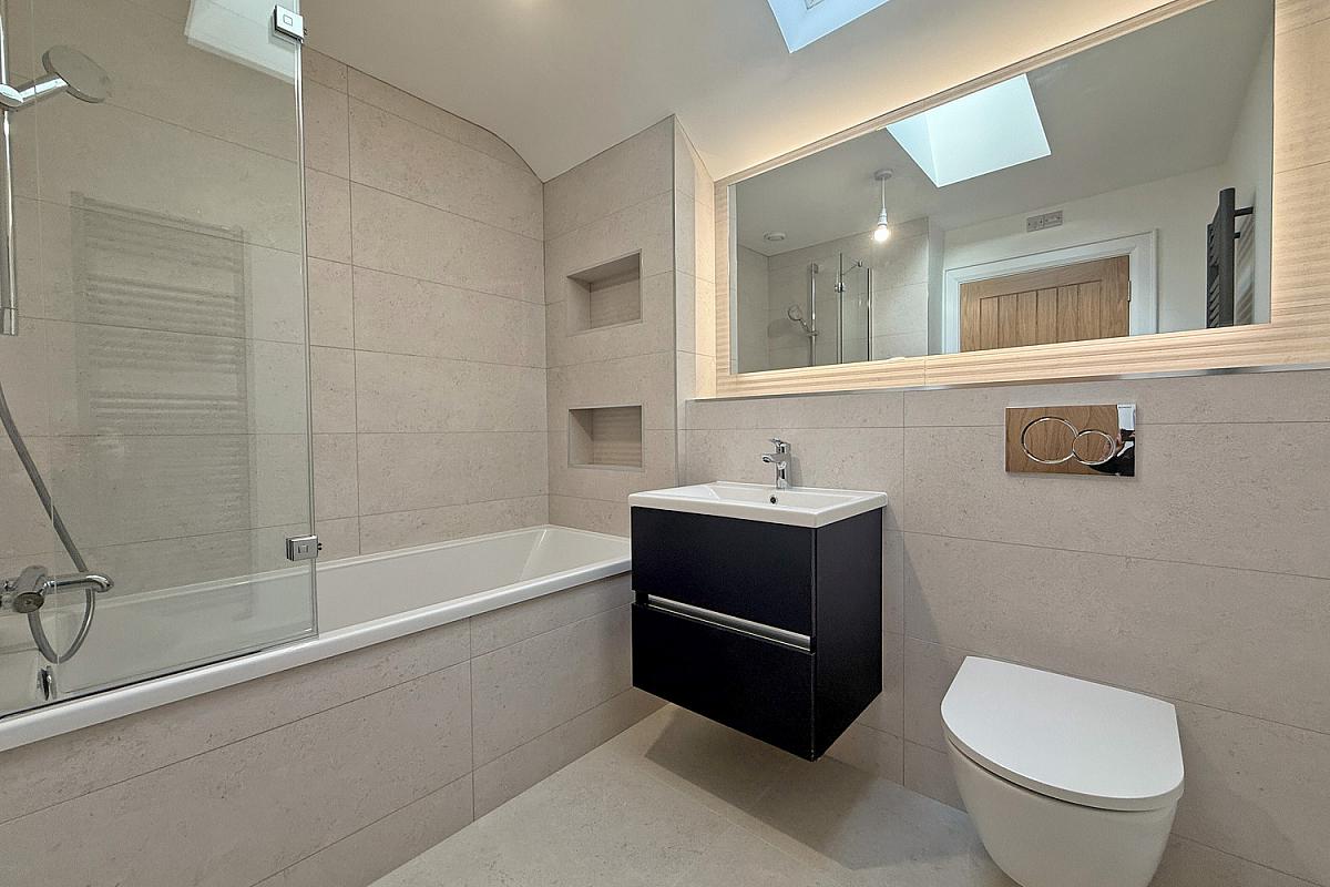 Tiled panel bath with shower over; vanity unit with wash hand basin and feature backlit mirror; wall mounted toilet; matt black towel radiator; tiled flooring and tiled walls.