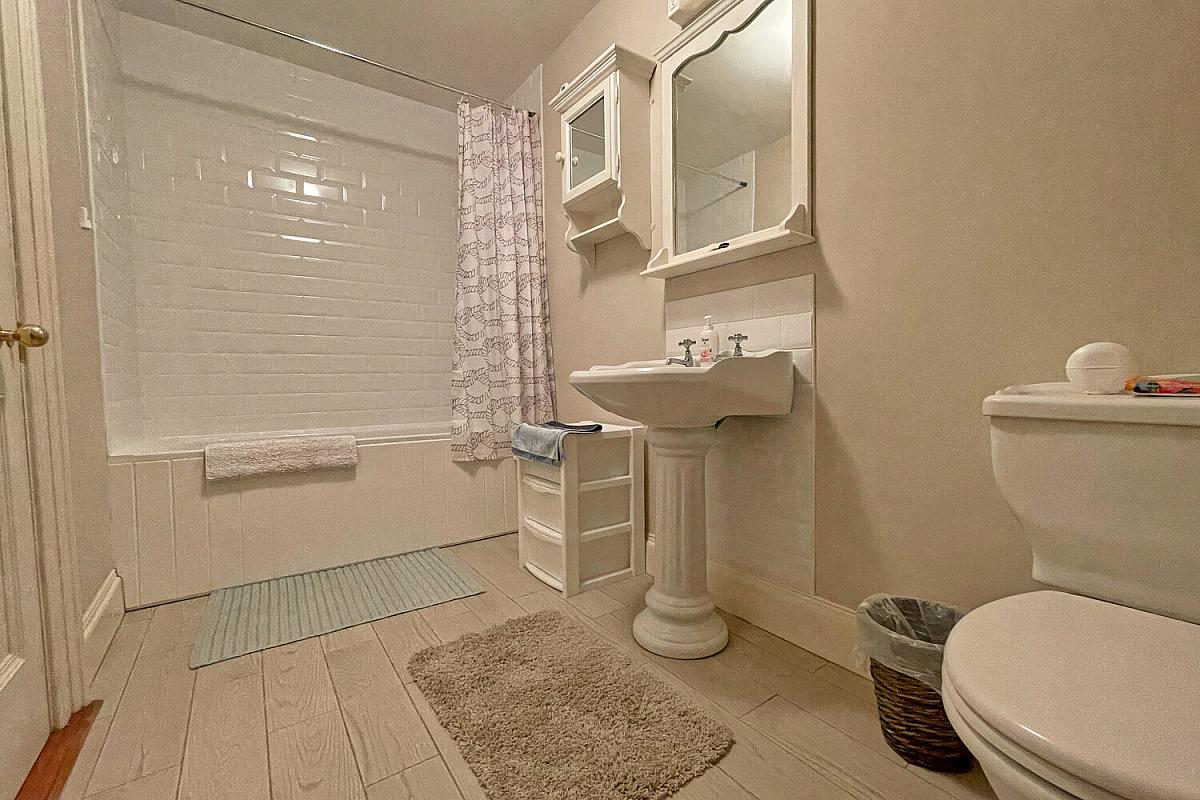Panel bath with shower over; toilet; wash hand basin; tiled floor; extractor fan.