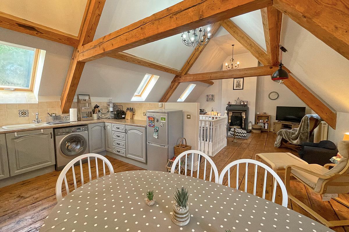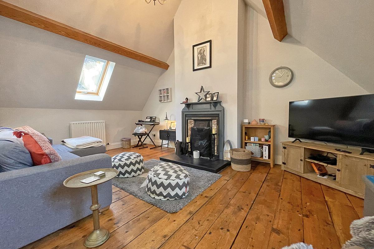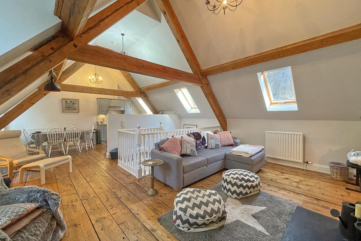 The first floor offers an impressive open plan living space, highlighted by vaulted ceilings and beautiful reclaimed wood floors, creating a sense of warmth and character. Partial sea views add a touch of coastal charm to the property, while the surrounding communal gardens provide a peaceful retreat. Like all homes in this prestigious development, direct access to the scenic coastal path ensures the beauty of the North Coast is never far away.