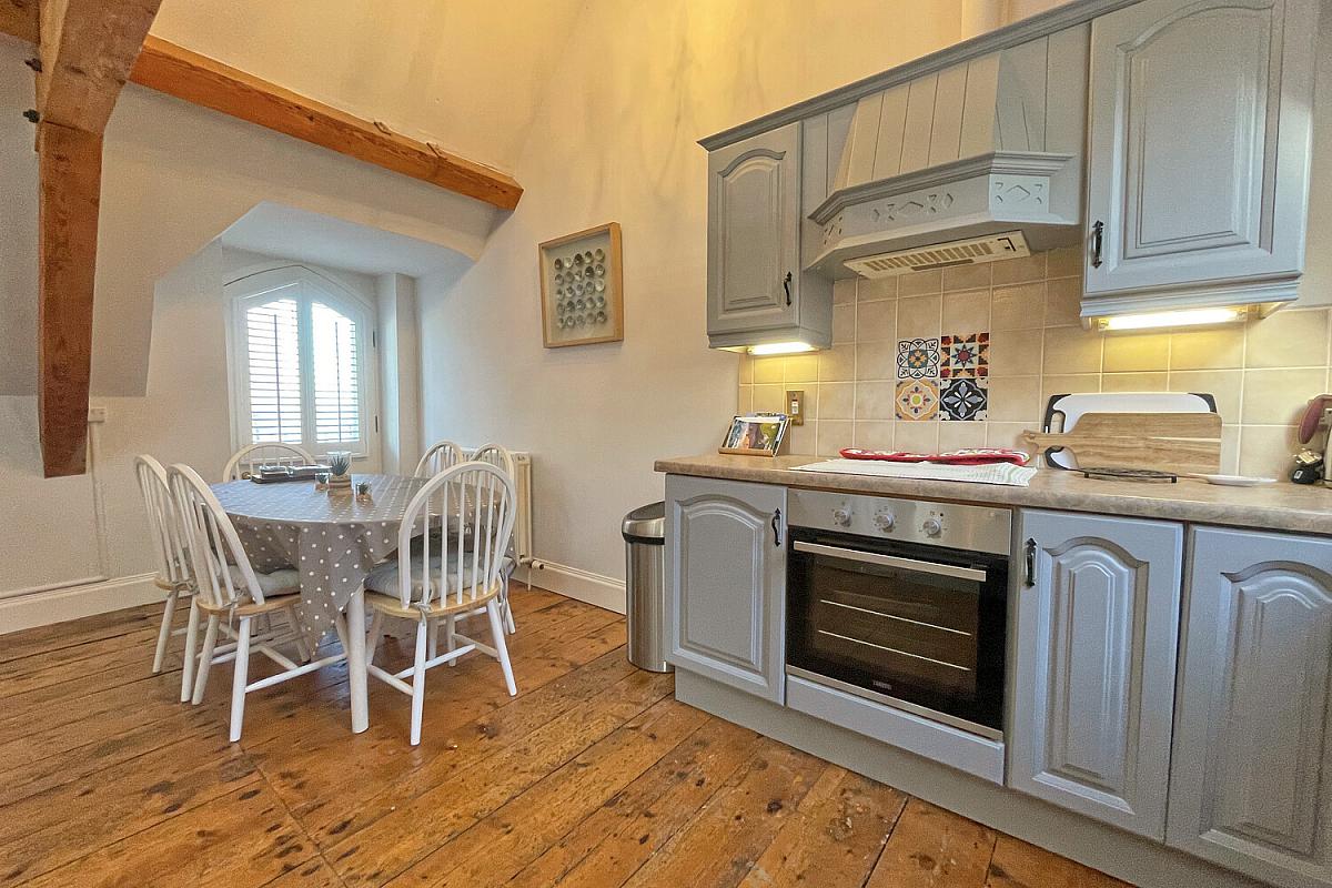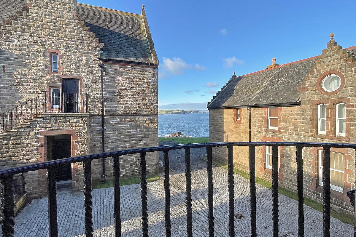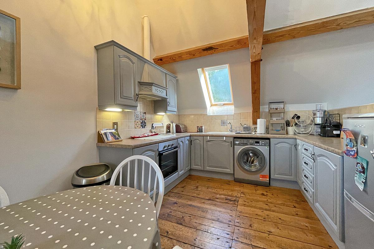 Range of fitted units; laminate work surfaces; sink; electric oven & hob with extractor unit over; space for fridge; plumbed for washing machine; Juliet balcony with partial sea views.