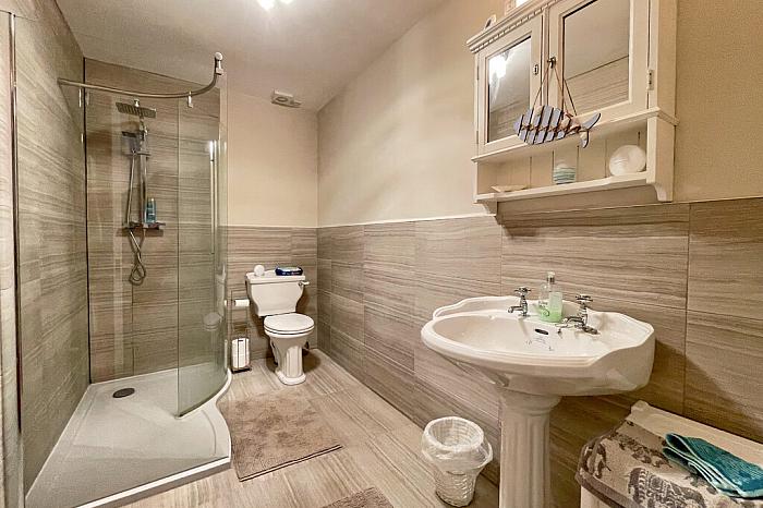 Large tiled shower cubicle; toilet; wash hand basin; tiled floor; chrome towel radiator; extractor fan.
