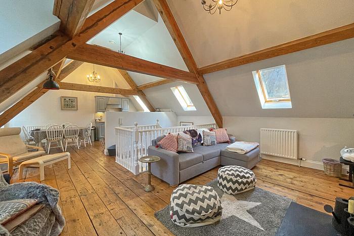 The first floor offers an impressive open plan living space, highlighted by vaulted ceilings and beautiful reclaimed wood floors, creating a sense of warmth and character. Partial sea views add a touch of coastal charm to the property, while the surrounding communal gardens provide a peaceful retreat. Like all homes in this prestigious development, direct access to the scenic coastal path ensures the beauty of the North Coast is never far away.