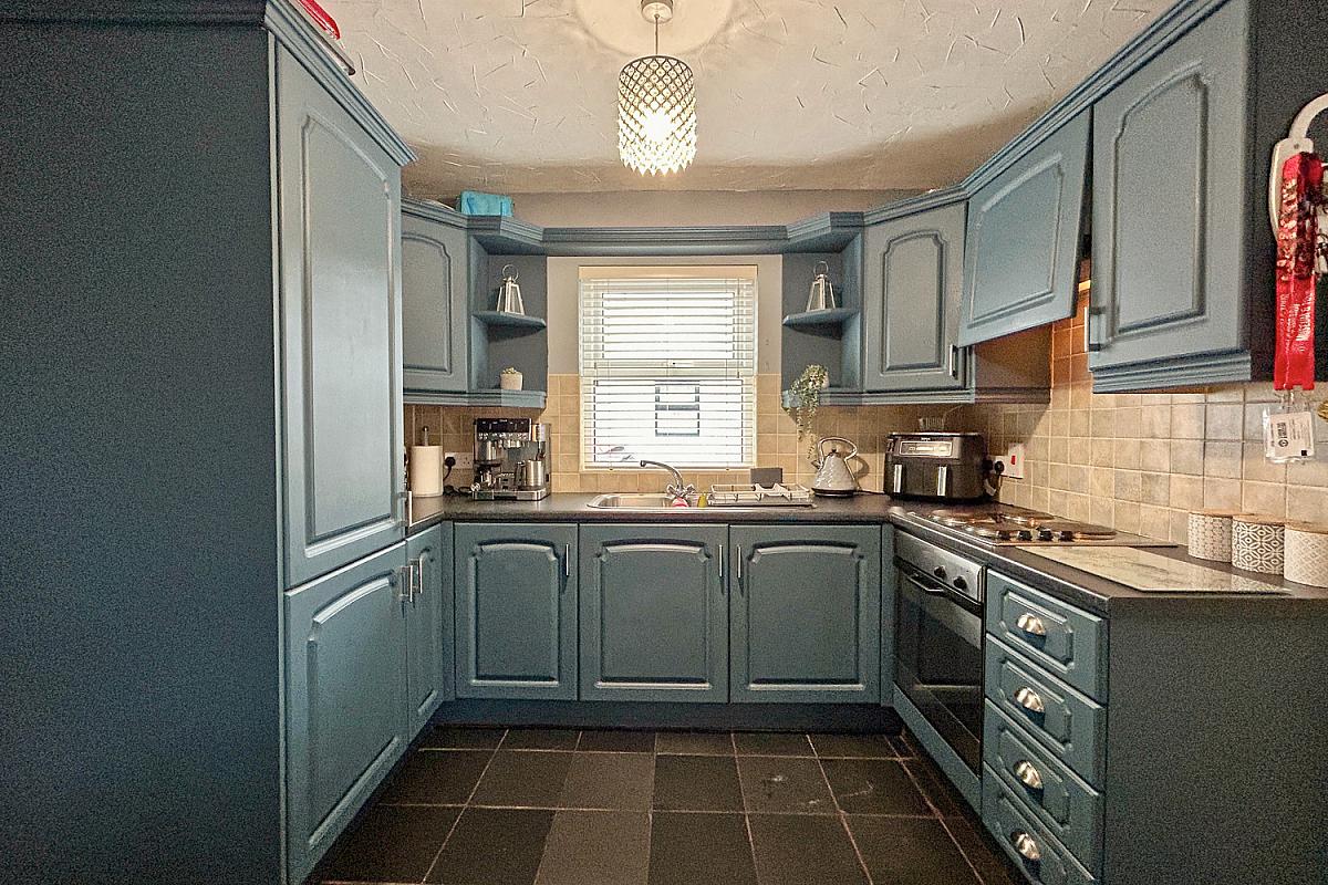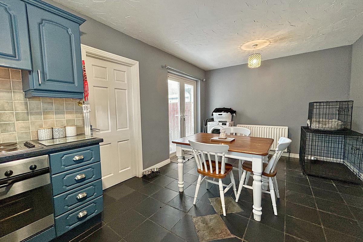 Range of fitted units; laminate work surfaces; stainless steel sink & drainer; integrated fridge freezer; electric oven & hob with extractor unit over; tiled floor; part tiled walls; space for dining; patio doors leading to the rear from dining area.