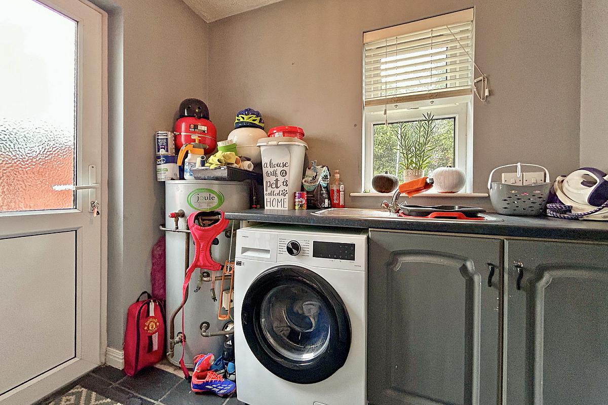 Fitted bench with laminate work surfaces & stainless steel sink; plumbed for washing machine; tiled floor; door to the side.