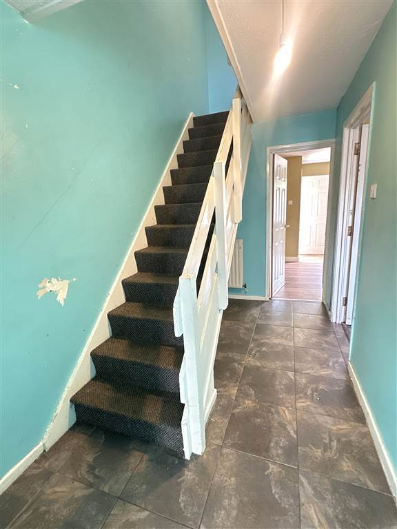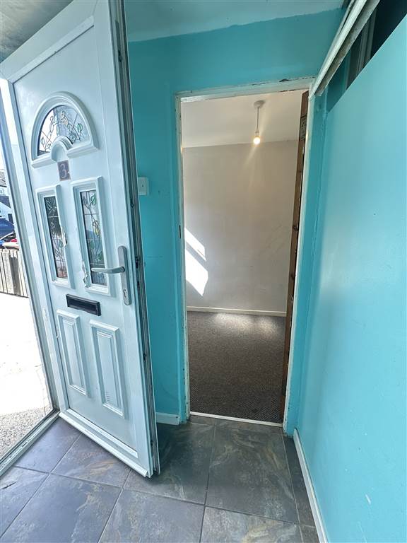 With PVC front door with decorative glazed panes. Staircase to first floor. Built-in storage cupboard with access to loft. Tiled flooring.