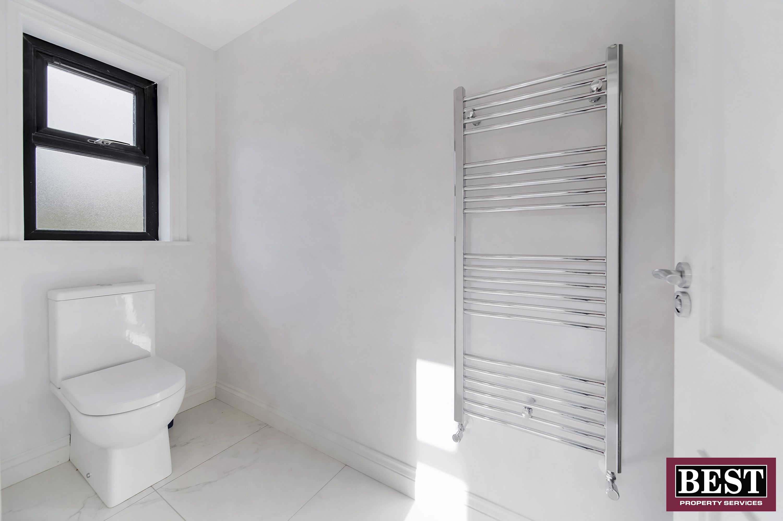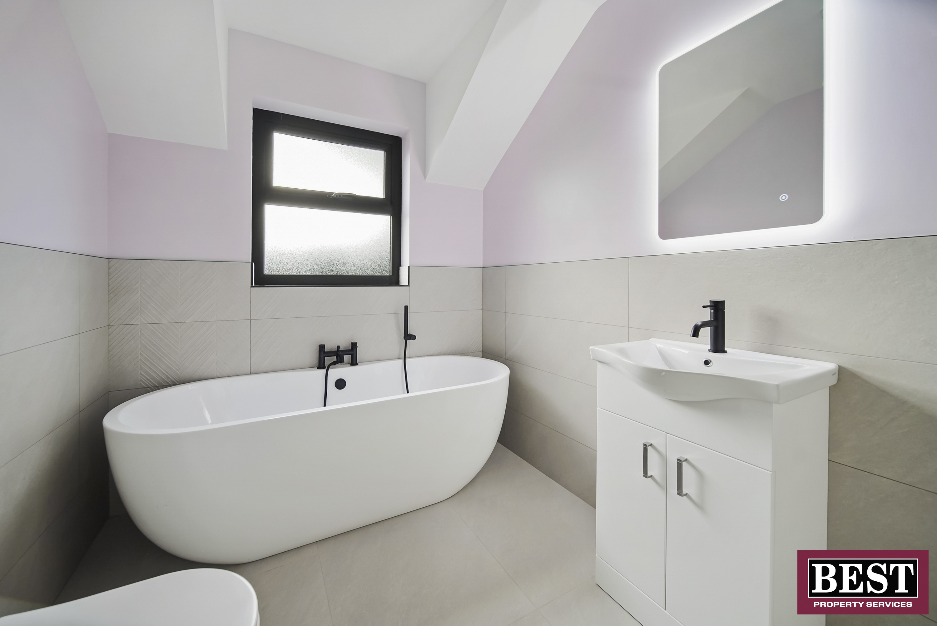 Bathroom (3.00m x 2.00m) with freestanding bathtub shower, tiling and contemporary black fittings incl heated towel rail