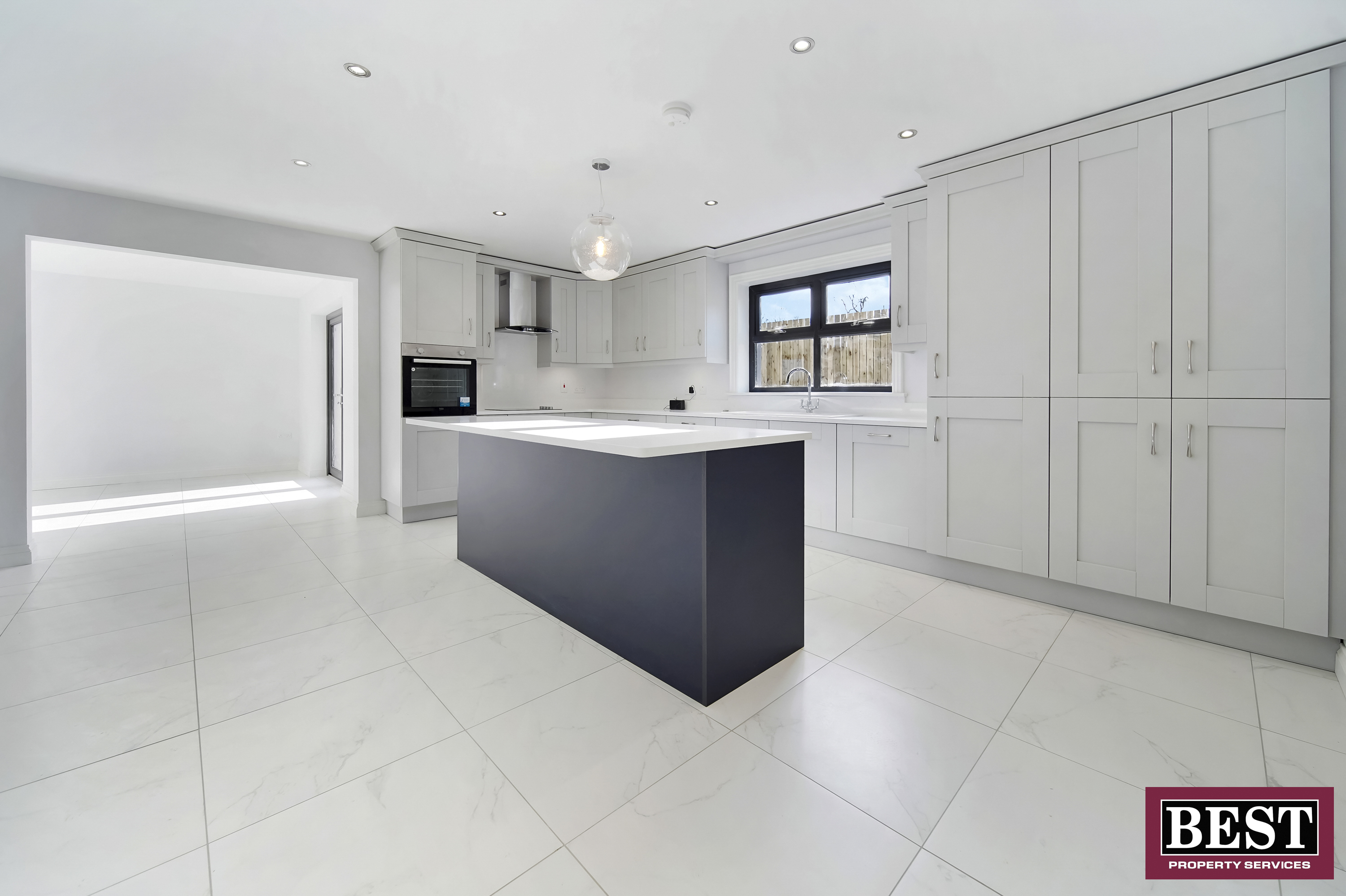 Fitted with washing machine, tumble dryer, stainless steel sink, full range of fitted cupboards.