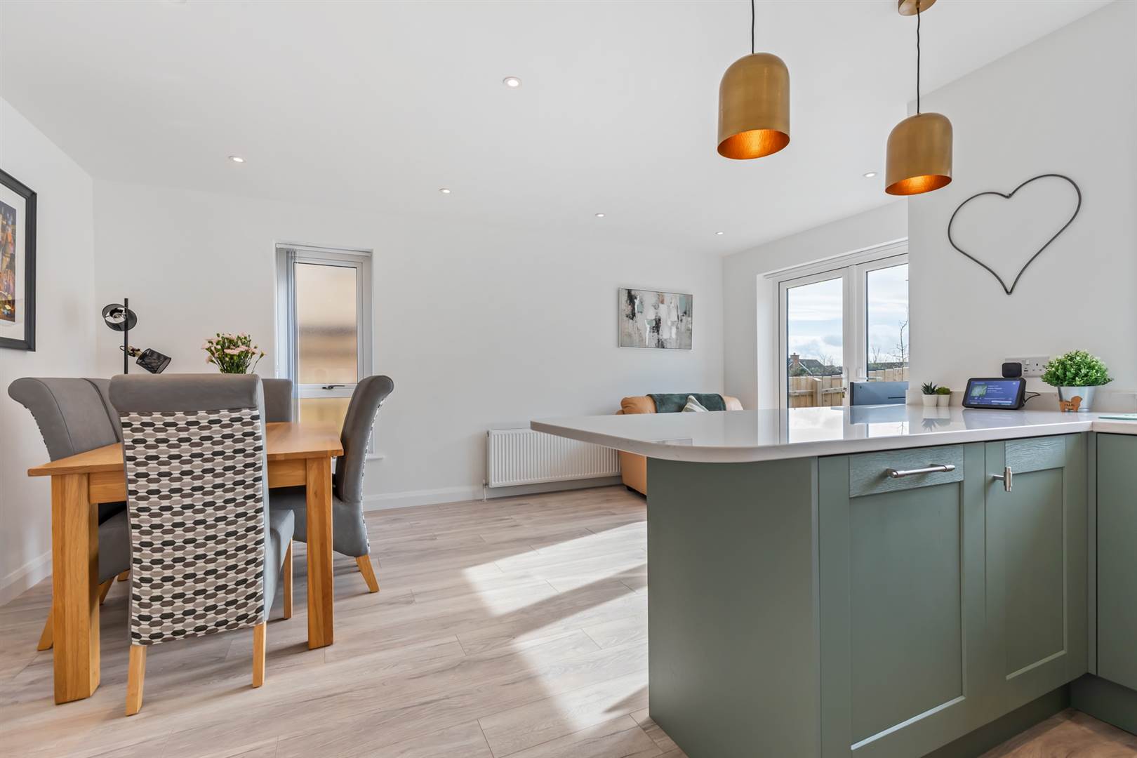 Partially glazed oak door. Excellent range of high and low level two tone shaker style units with soft close doors and bespoke pantry cupboard with integrated lighting, Lunar Quartzstone worktops, splashback and rounded edge peninsula, Blanco one and a half bowl sink unit with mixer tap, built-in bin system, and integrated Bosch dishwasher, fridge freezer and washing machine. Feature lighting beneath and above cabinets. Space for range with concealed extractor fan above. Laminate flooring. Open plan to living/ dining room with recessed spotlighting and laminate flooring. PVC double glazed double doors opening to the patio and garden.