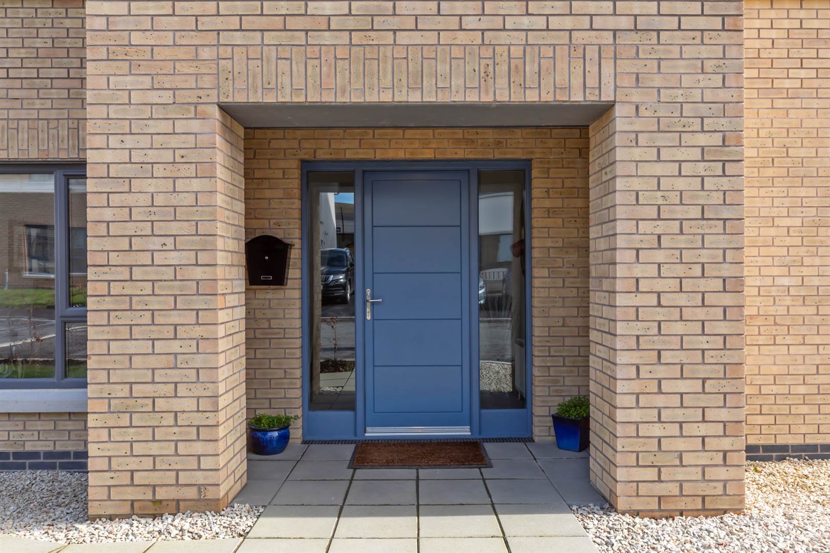 Painted hard wood panelled front door with side lights to: