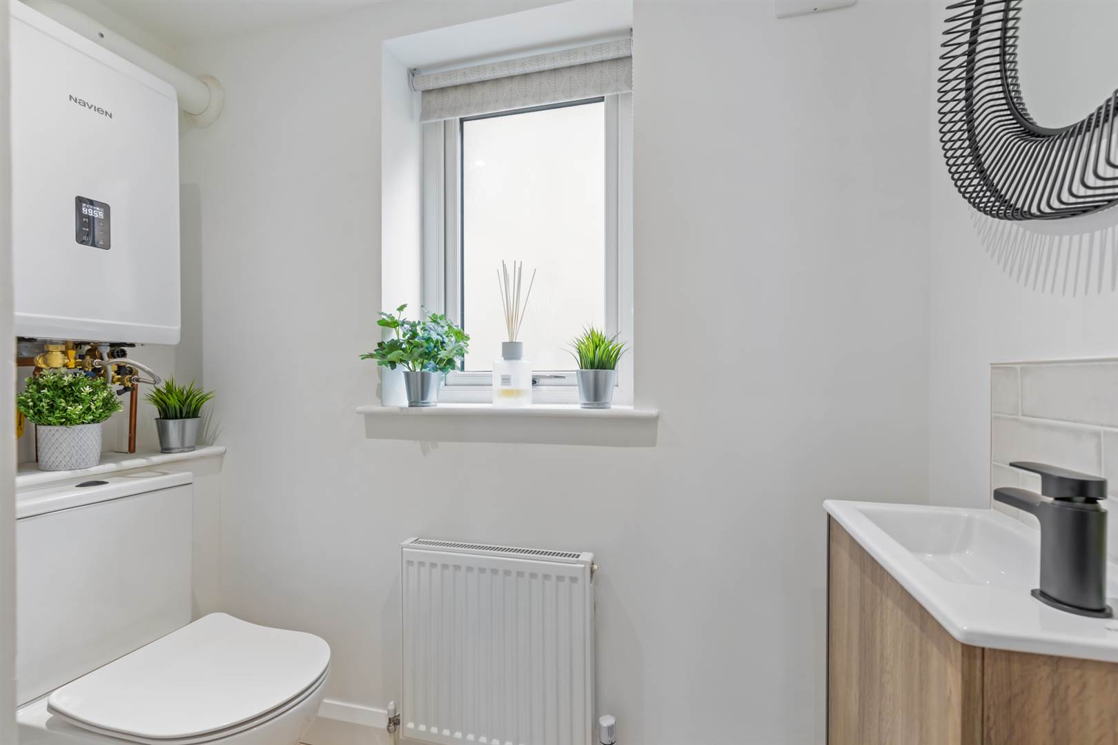 Two piece white suite comprising wall-mounted vanity unit incorporating integrated basin with mixer tap and tiled splashback, low flush wc, space for tumble dryer, Navien gas boiler, laminate flooring, recessed spotlighting, extractor fan.