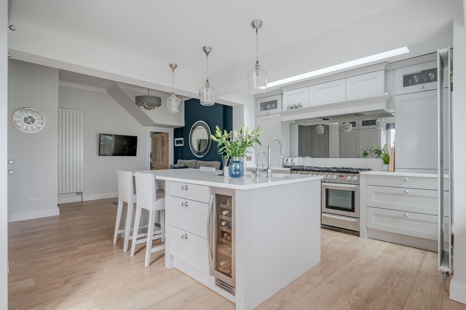 A welcoming covered porch and original front door open into a bright reception hall, where period detailing immediately conveys the home´s character. The layout flows naturally, with two generous reception rooms creating warm and versatile spaces for relaxation or entertaining. At the heart of the property lies an impressive open plan kitchen, living, and dining space-designed with modern living in mind. With its bespoke finish, excellent storage, central island, and feature glazing that floods the room with natural light, this is a superb area for family gatherings or hosting friends, with seamless access to the garden for indoor-outdoor living. Downstairs also benefits from a shower room and WC.